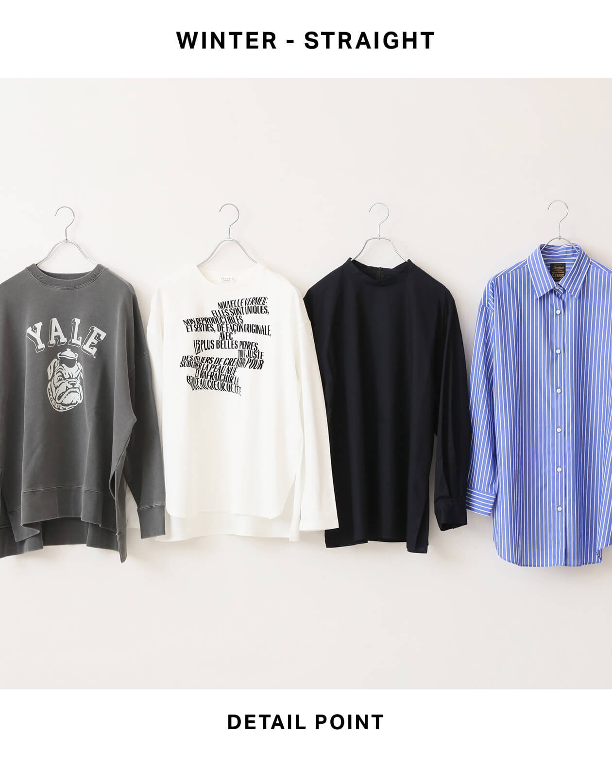 程よく厚みとハリのある素材が似合うストレートタイプ。肉厚なカットソーやかっちりしたシャツデザインがおすすめです。ストライプシャツは肩の落ちたゆるめのデザインが抜け感も◎。カジュアルコーデにはロゴアイテムで遊びを加えて。 - JOURNAL STANDARD relume《追加3》セイヒンゾメカレッジスリットスウェット◆¥8,800(税込)