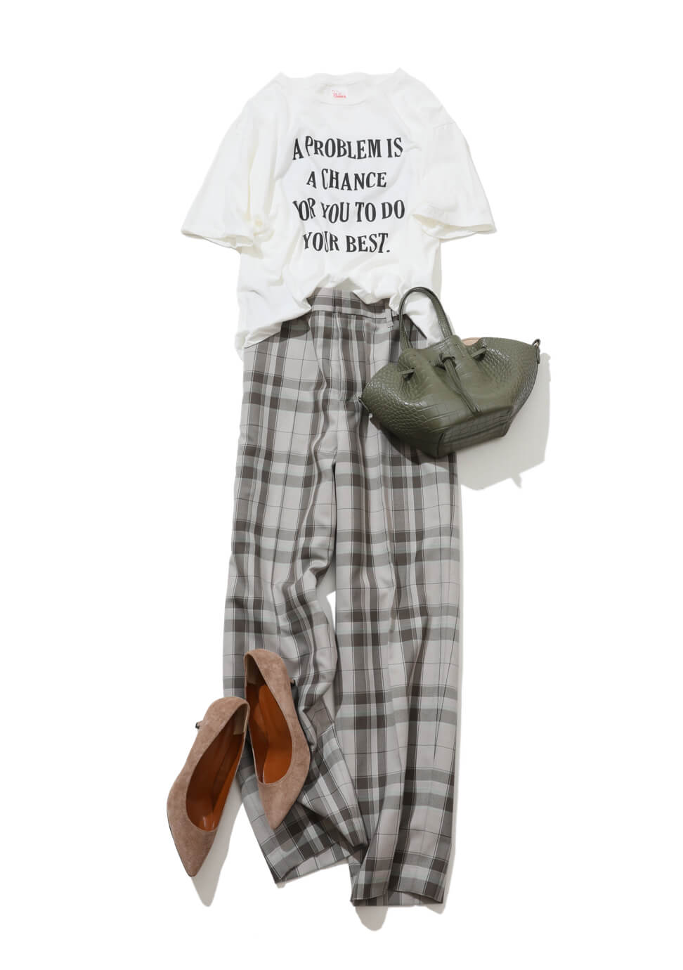 春夏から大活躍の白Tは、トレンドというだけでなく今っぽいラフさや自分らしさを表現できる相棒のような存在に。秋も継続してきこなしたいから、ボトムスやアクセで季節感を加えて。優しいニュアンスが漂うグレーのチェックパンツにポインテッドトゥを合わせて、女らしさをほどよくミックスするのが◎。