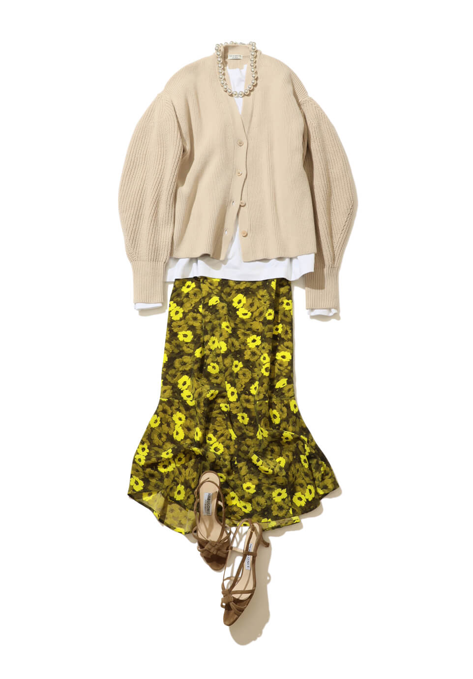 本日主役のスカートは、目を引くレトロなフラワープリントで春らしく。ヒップラインをキレイに見せてくれて、裾は動きのあるフレアラインも特徴。バルーン袖のニットカーディガンはナチュラルな色味で、スカートを引き立てて。コーデを今年っぽくスタイリッシュにまとめる、存在感◎なチョーカー風のシルバーネックレスがポイント。