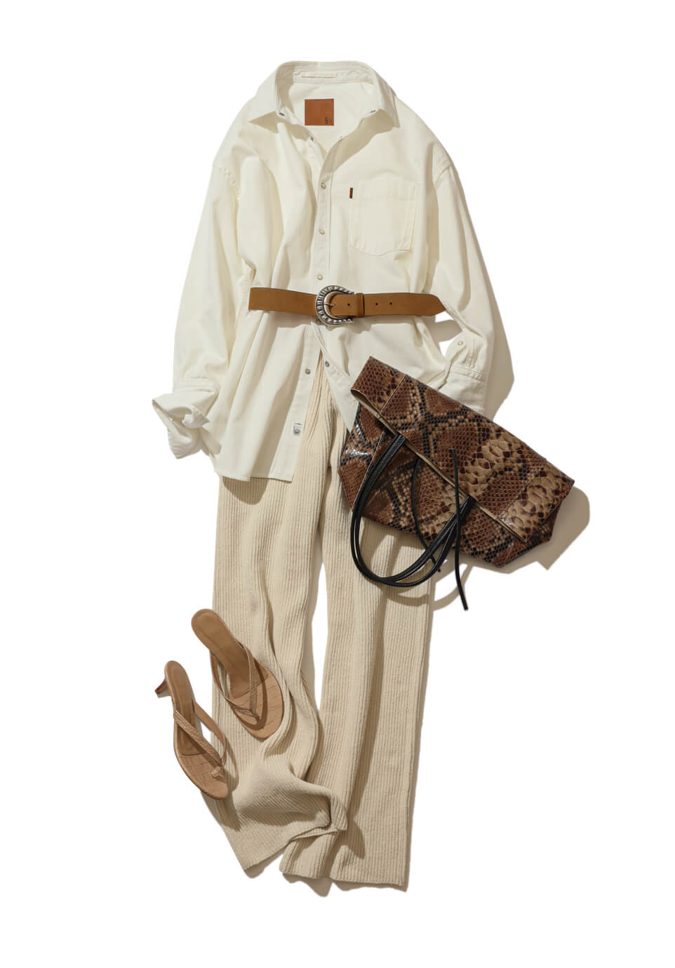 春めくワントーンコーデといえば、オールホワイト。素材を変えたりパンチの効いた小物を加えたりして、奥行きのあるトーン・オン・トーンに仕上げるのがコツ。さらに今っぽいラフさを加えるなら、トップスはデニムシャツが最適解。去年と差がつくワンランク上の白コーデを楽しんで。