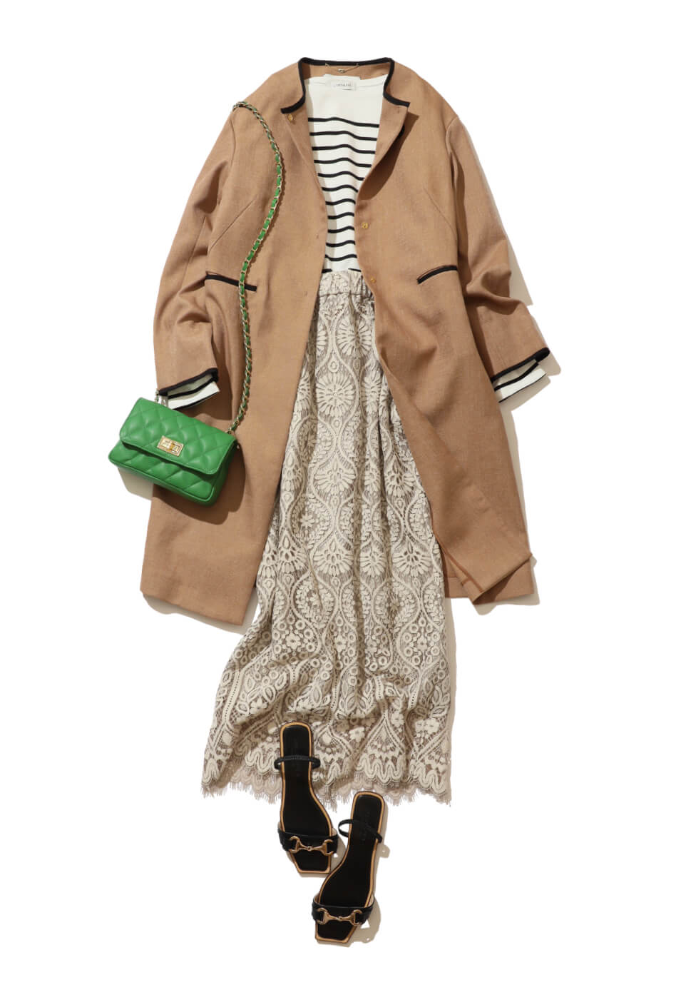 休日コーデにぴったりなパネルボーダープルオーバーを、今日はちょっぴりキレイめにカジュアルアップ。1枚で着映えて女っぽさを香らせる、こだわりレースのペンシルスカートをつないで、上品キャメルのノーカラーコートをオン。仕上げに、パキッとしたグリーンのショルダーバッグで垢抜け。