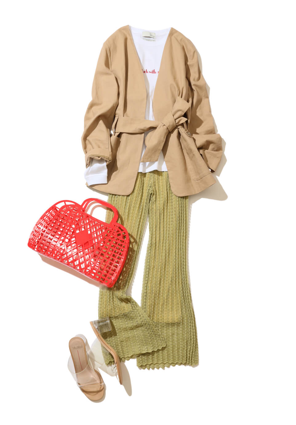 リモートワークの金曜日は、キレイめにも着こなせるノーカラージャケットの中にロゴTを差し込んで、気張りすぎないコーデをメイク。トレンドのグリーンを透かし編みニットで落とし込んだボトムスで、春らしく軽快に。目を引く鮮やかなカラーバッグとクリアヌードサンダルで遊びを効かせて!