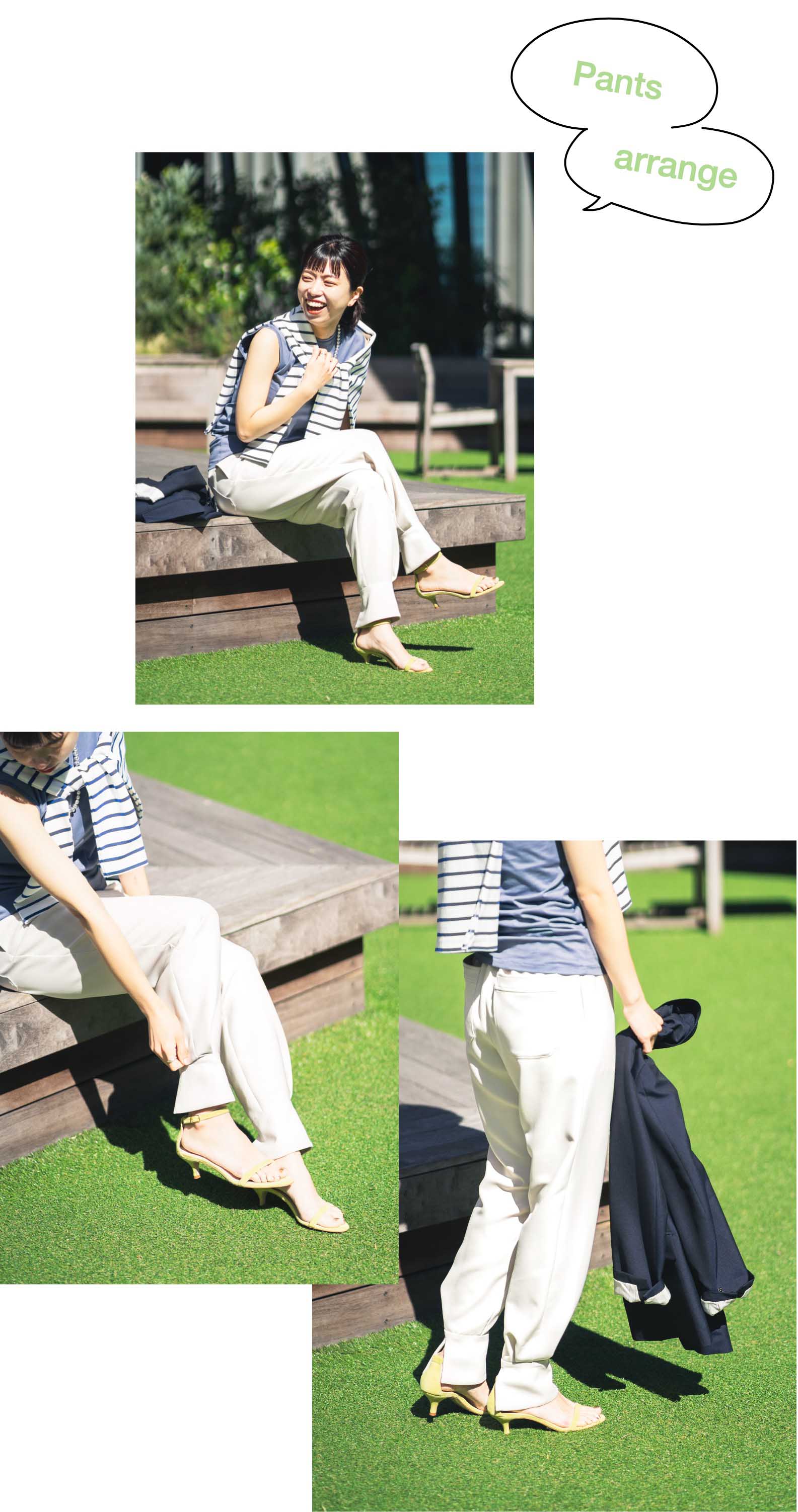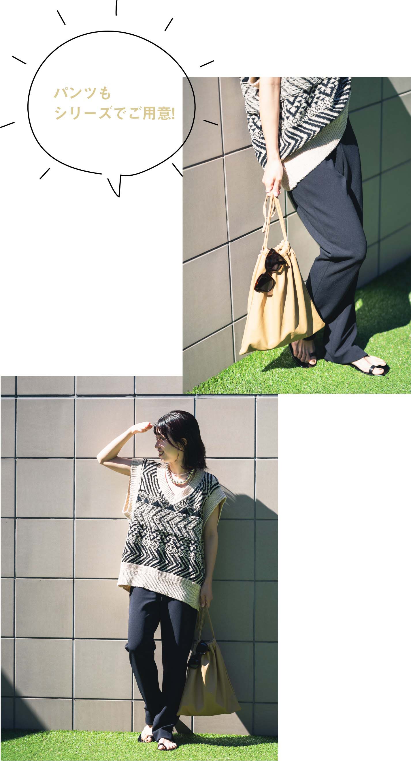 - 一見、きれいめなシンプルパンツも、モノトーンでほんのりモードなスタイルに。