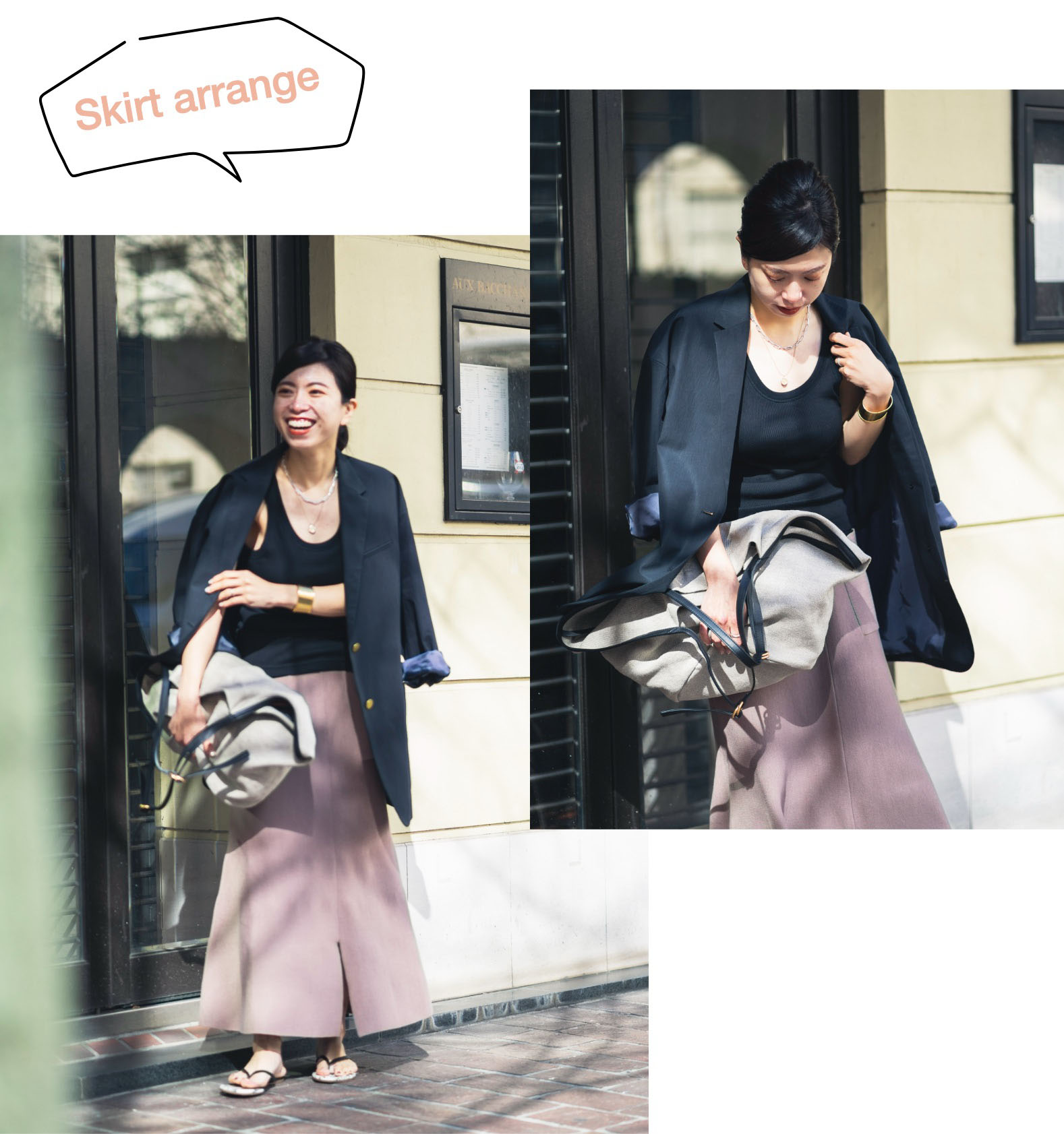 - リラックス感のあるニットスカートはジャケットと合わせることで知的さをプラスして。タンクトップやサンダルでヘルシーな夏も楽しみたい!
