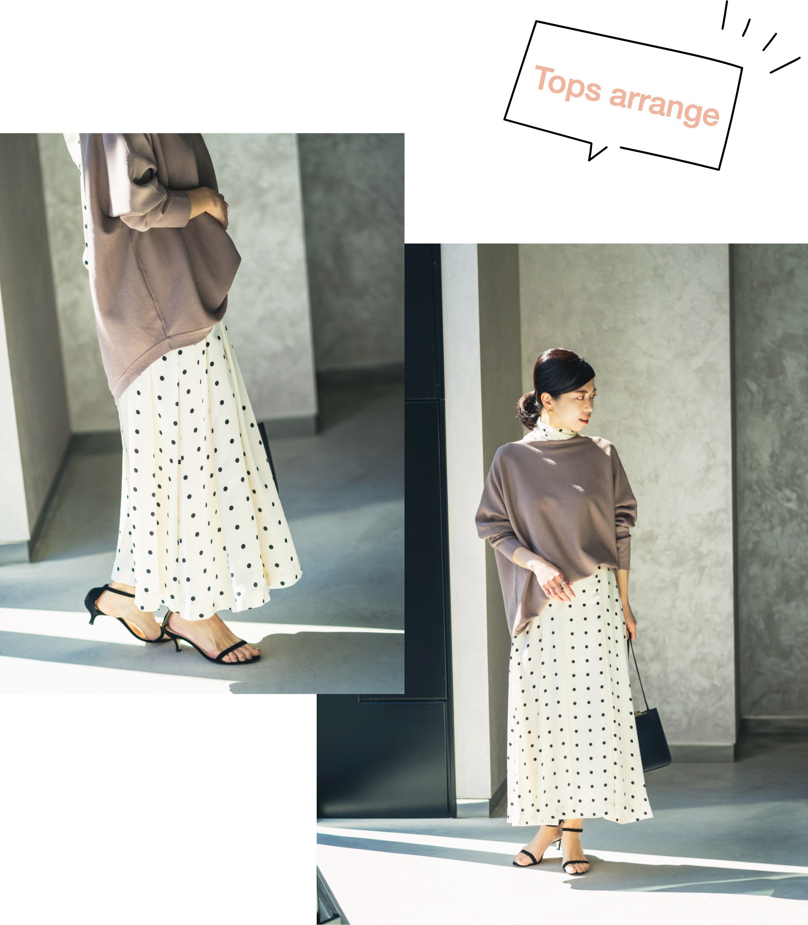 - シンプルなトップスには、ドット合わせでVERMEILらしい茶目っ気たっぷりの女性らしい着こなしを。