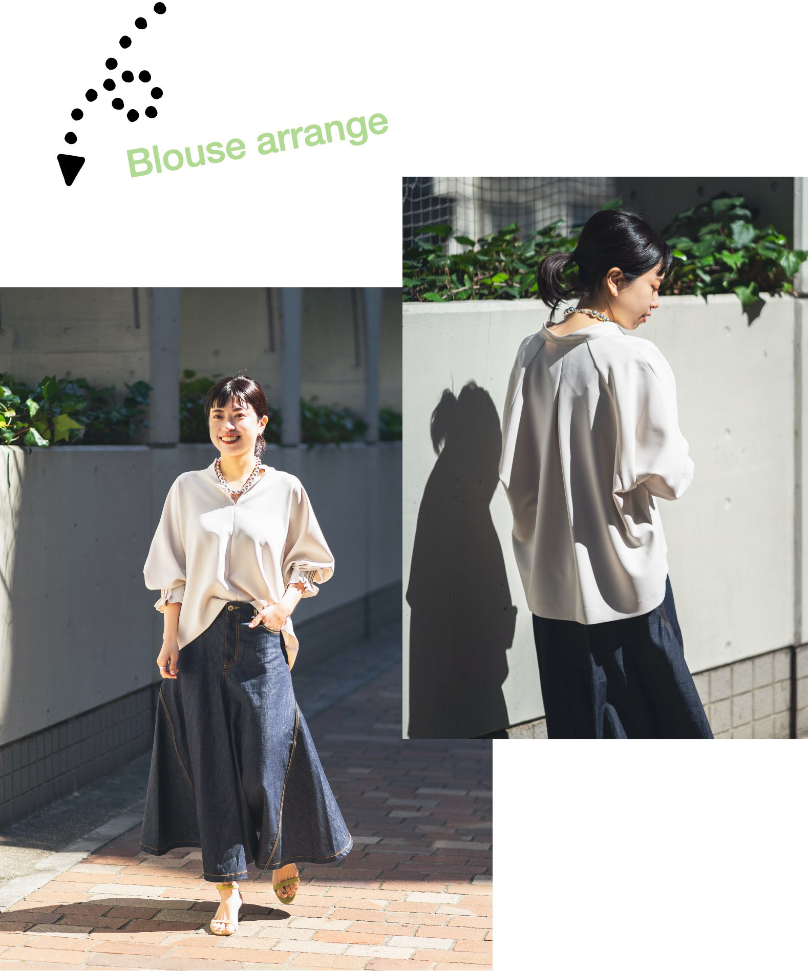 - カジュアルなデニムスカートが上品な大人の女性らしいスタイリングに仕上がるのも、綺麗目ブラウスのおかげ。
