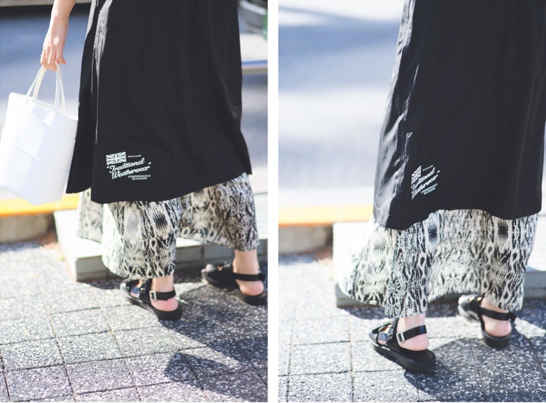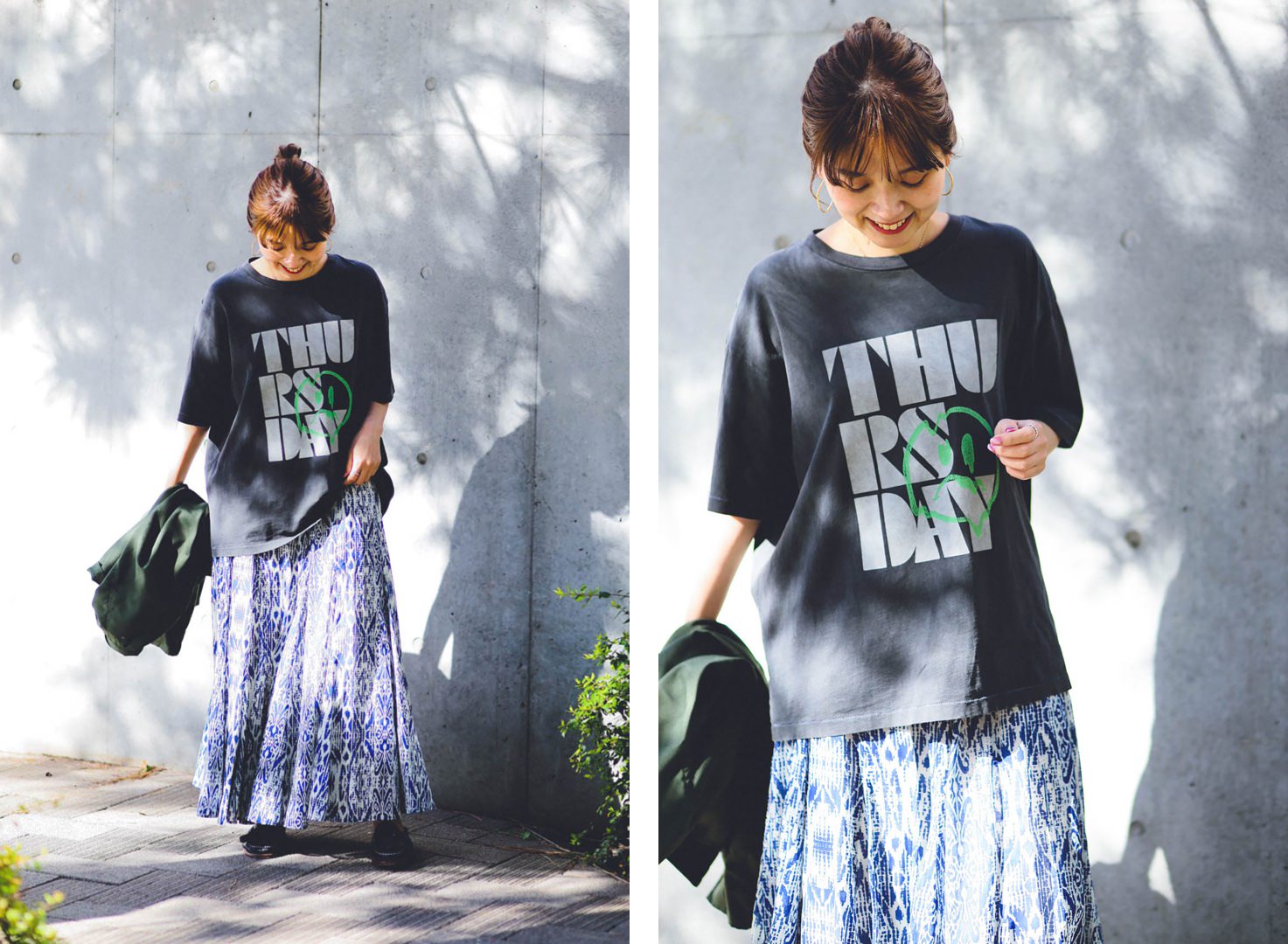 トップスはインしても、オーバーサイズのものを合わせてもすっきり見せる事ができる優秀なスカートです。ロゴTを合わせれば、クリーンでカジュアルな雰囲気に。