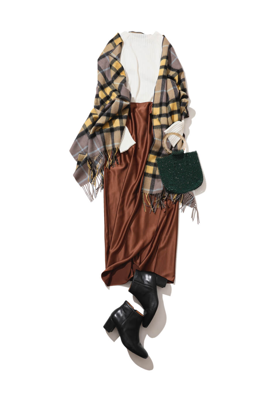 秋カラーでサテン生地が新鮮な、シルキーロングスカートを主役に。くるぶしまで隠れるマキシ丈のタイトスカートは、シンプルなリブニットと合わせるだけで旬なスタイルバランスを簡単に作れるからオススメ。チェックの大判ストールを巻きつけて、上半身に温かみあるボリュームを足し算。ビーズバッグを下げれば、ご機嫌なお出かけになりそう。
