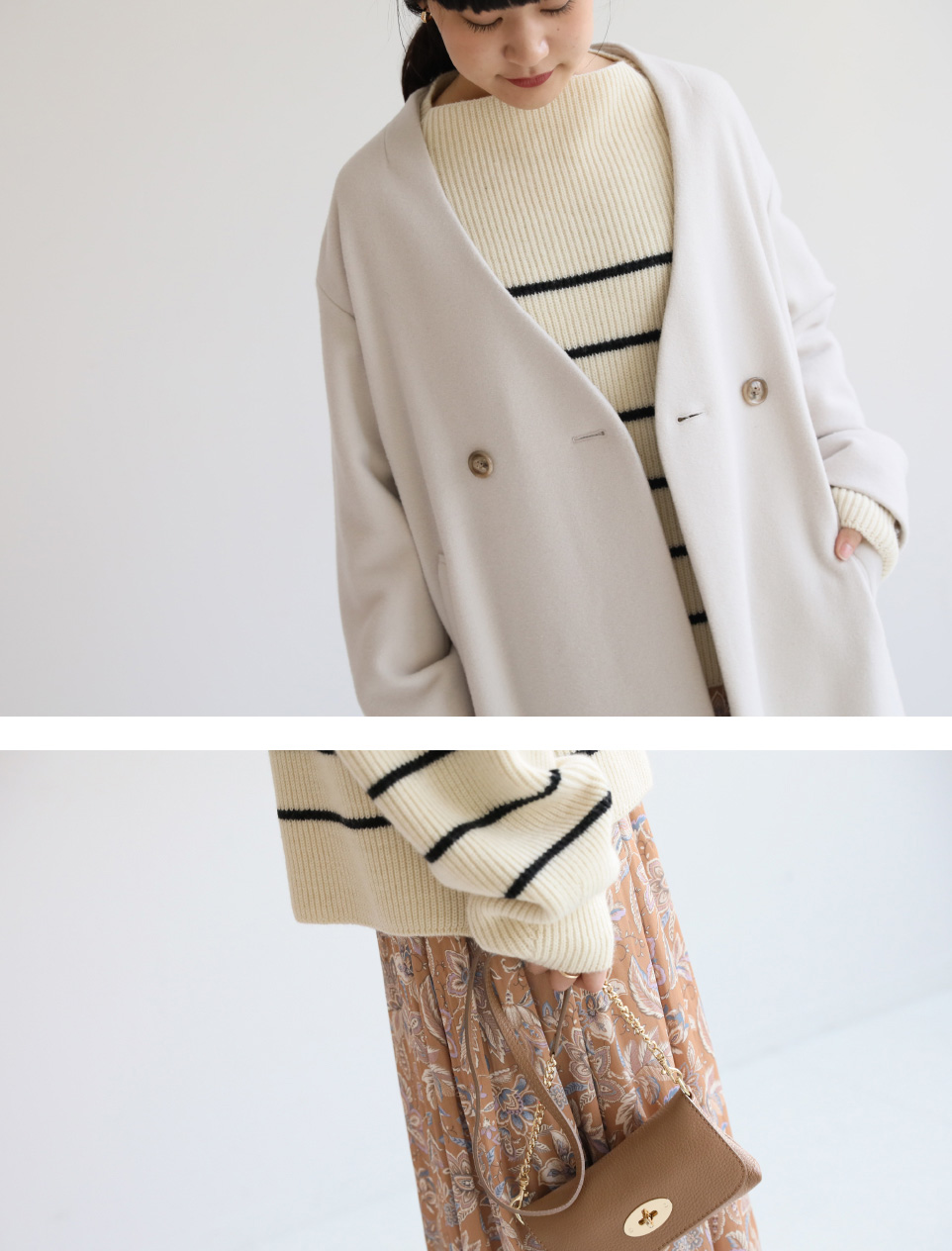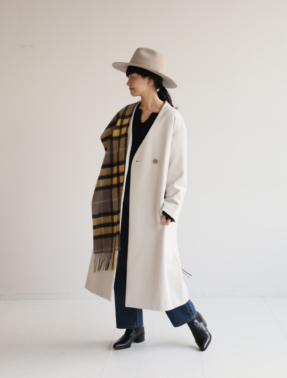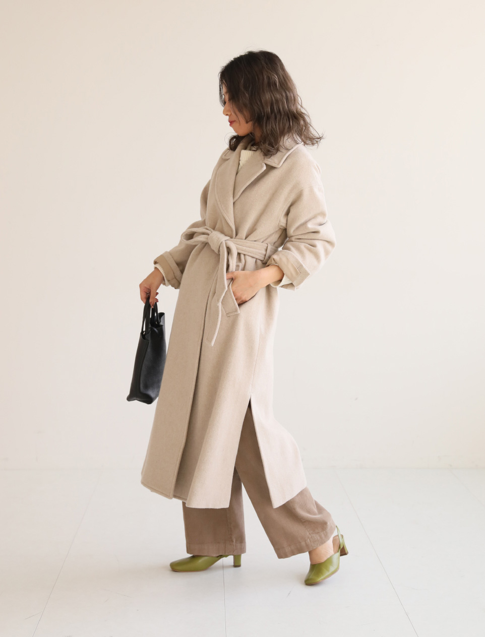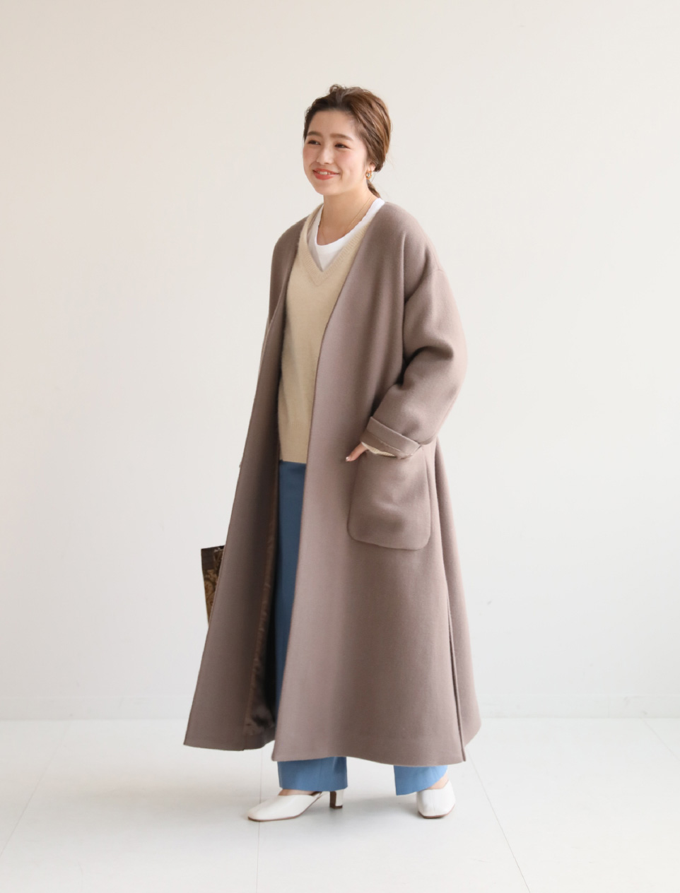 大きめの襟元が今年らしいのウールコート。プレーンなコールストレートパンツを合わせてこなれた感じに着こなせば、そのままお出かけしたい気分に。