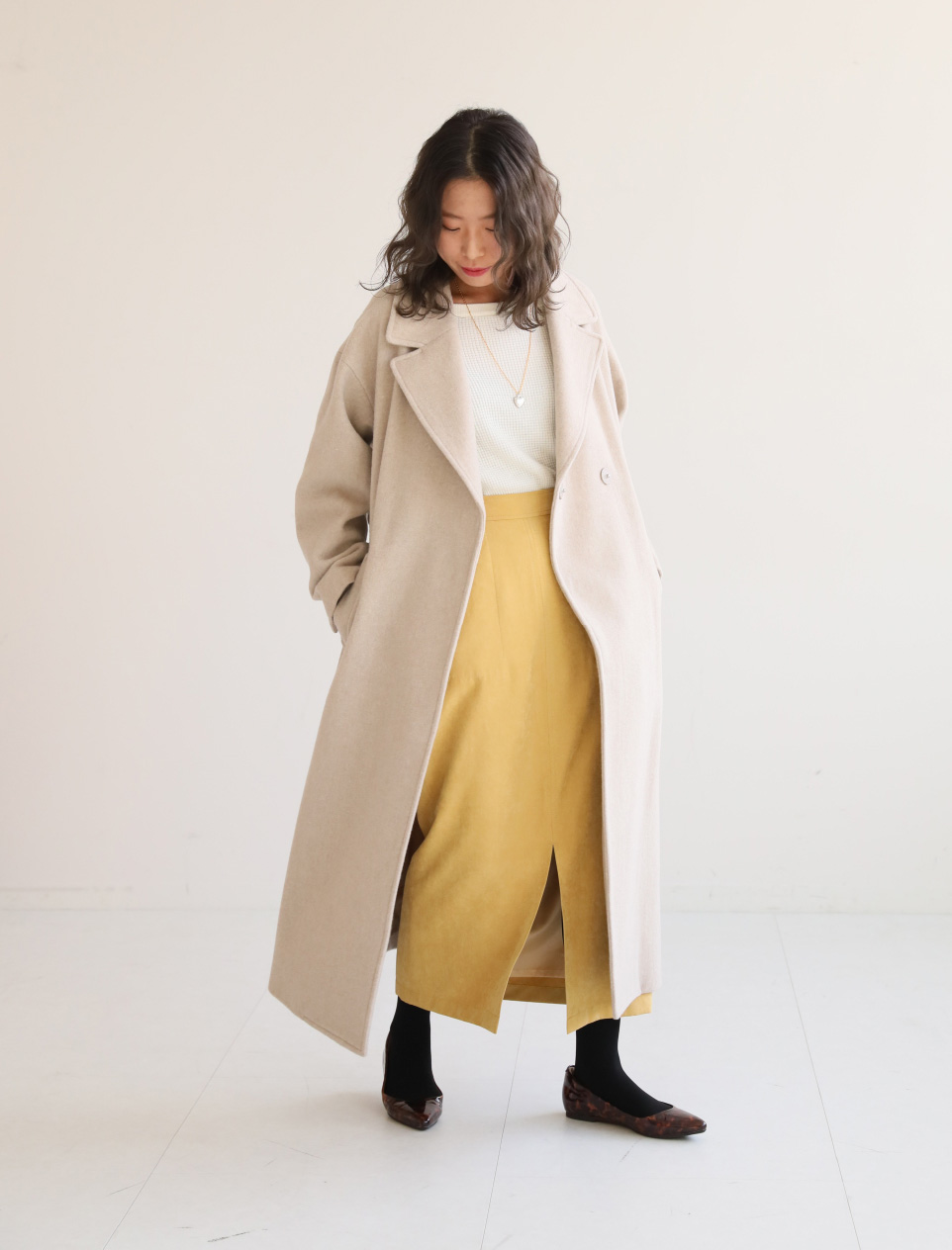 上質なウール糸を使ったふっくらとしたベージュコートには、鮮やかカラーのスカートを差し色にしたキレイめコーデもおすすめ。オフィスシーンにもしっくりとくる。