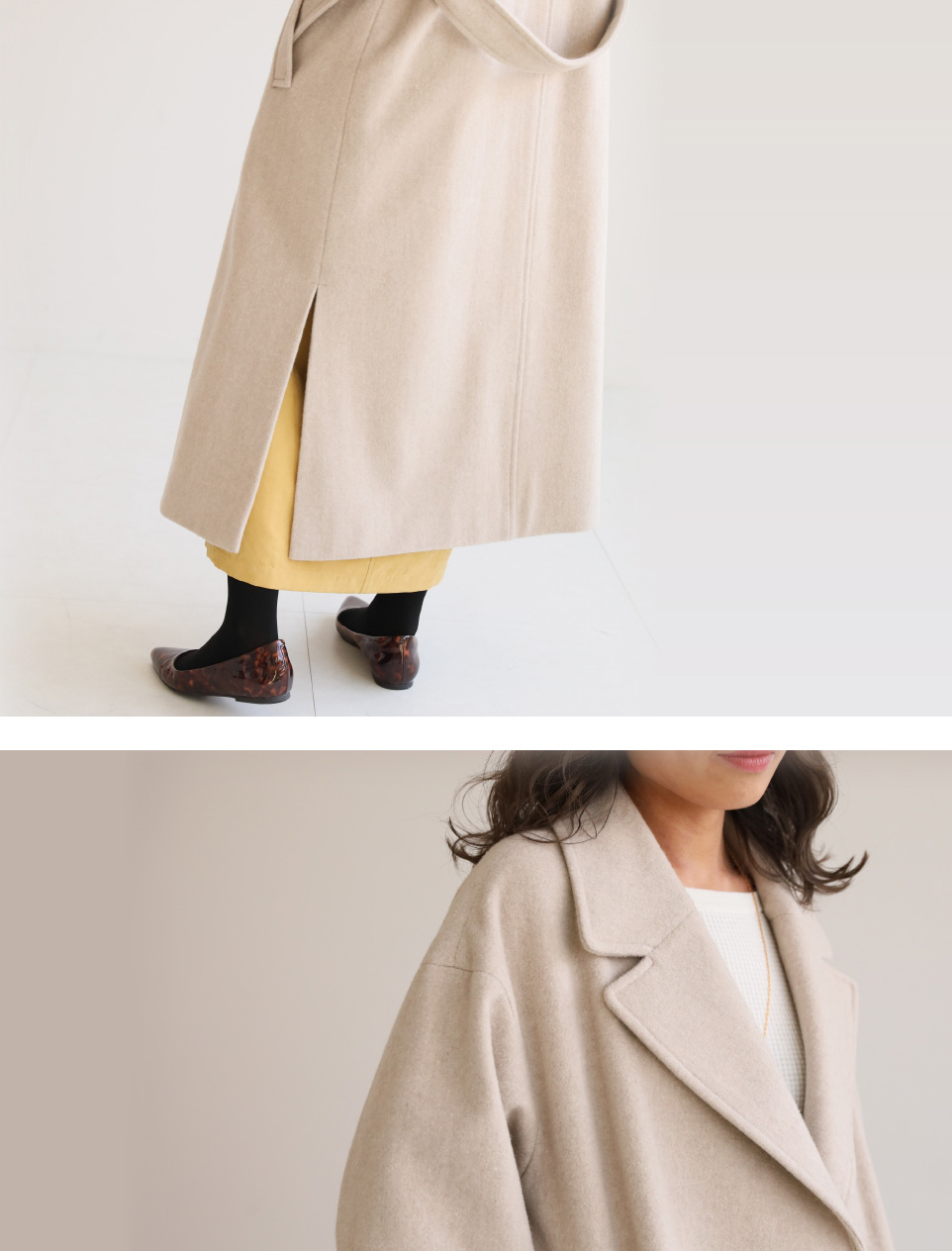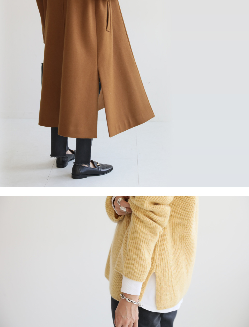 襟元のV開きとサイドのスリットが印象的なコート。カシミヤ混ニットトップとウールパンツを合わせた「あったか」コーデなら、ふらりとショッピングにでも出かけたくなる。