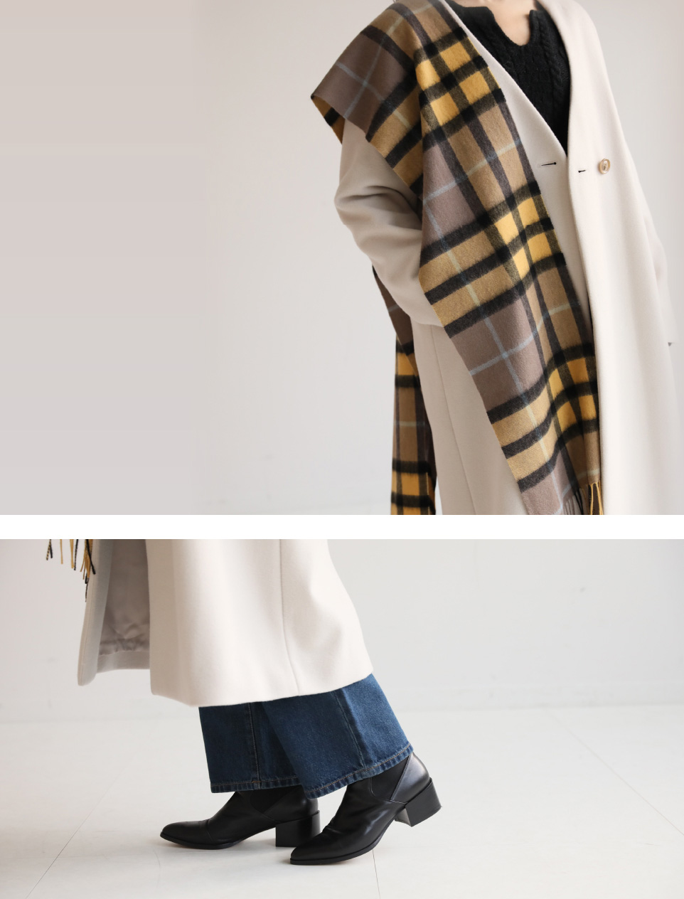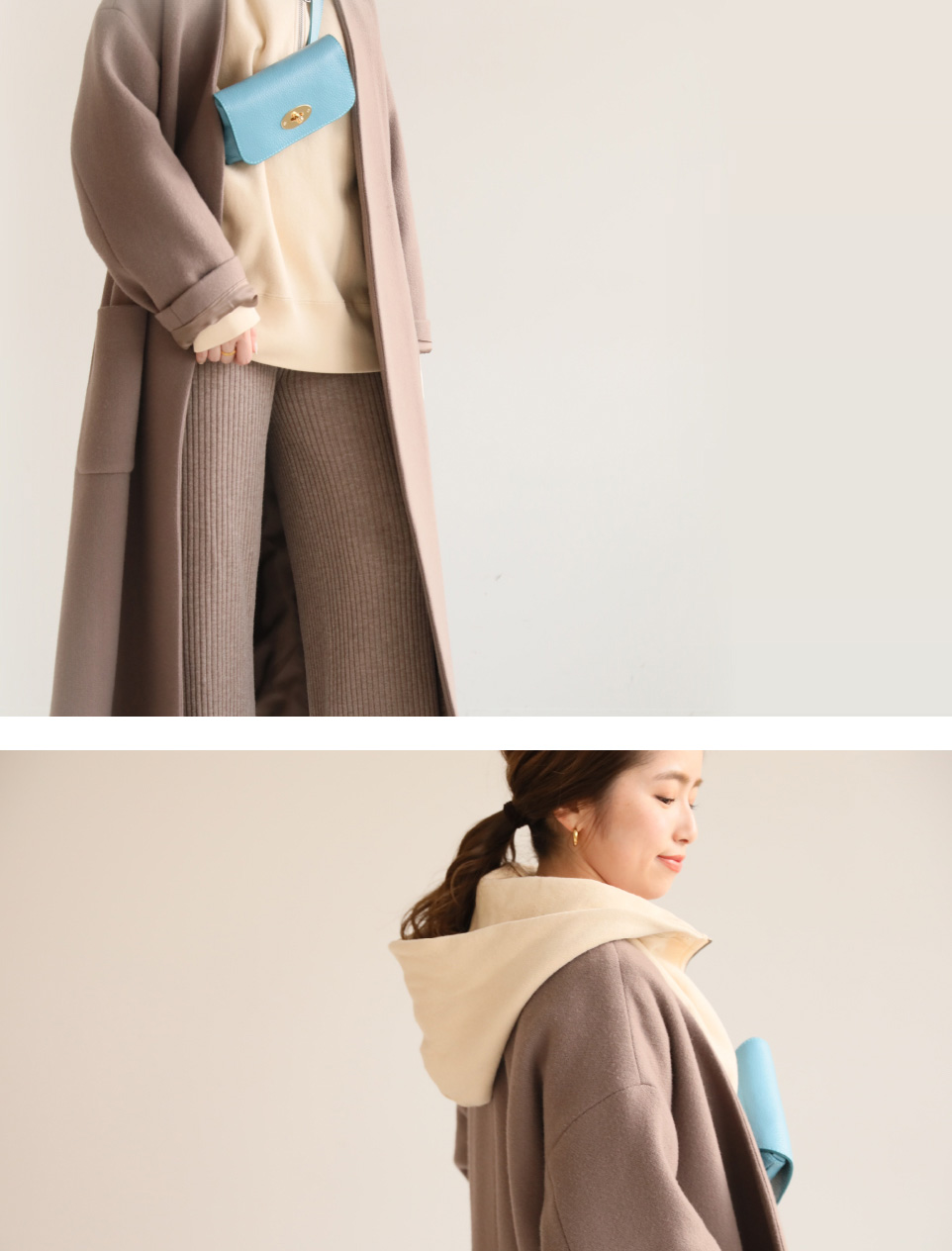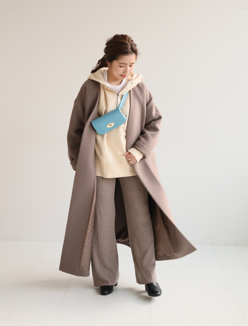 ノーカラーのコートはパーカーとの相性も抜群。足元は同系色のリブニットパンツとブーツをスタイリングして、肩肘張らない大人のワントーンスタイルに仕上げて。
