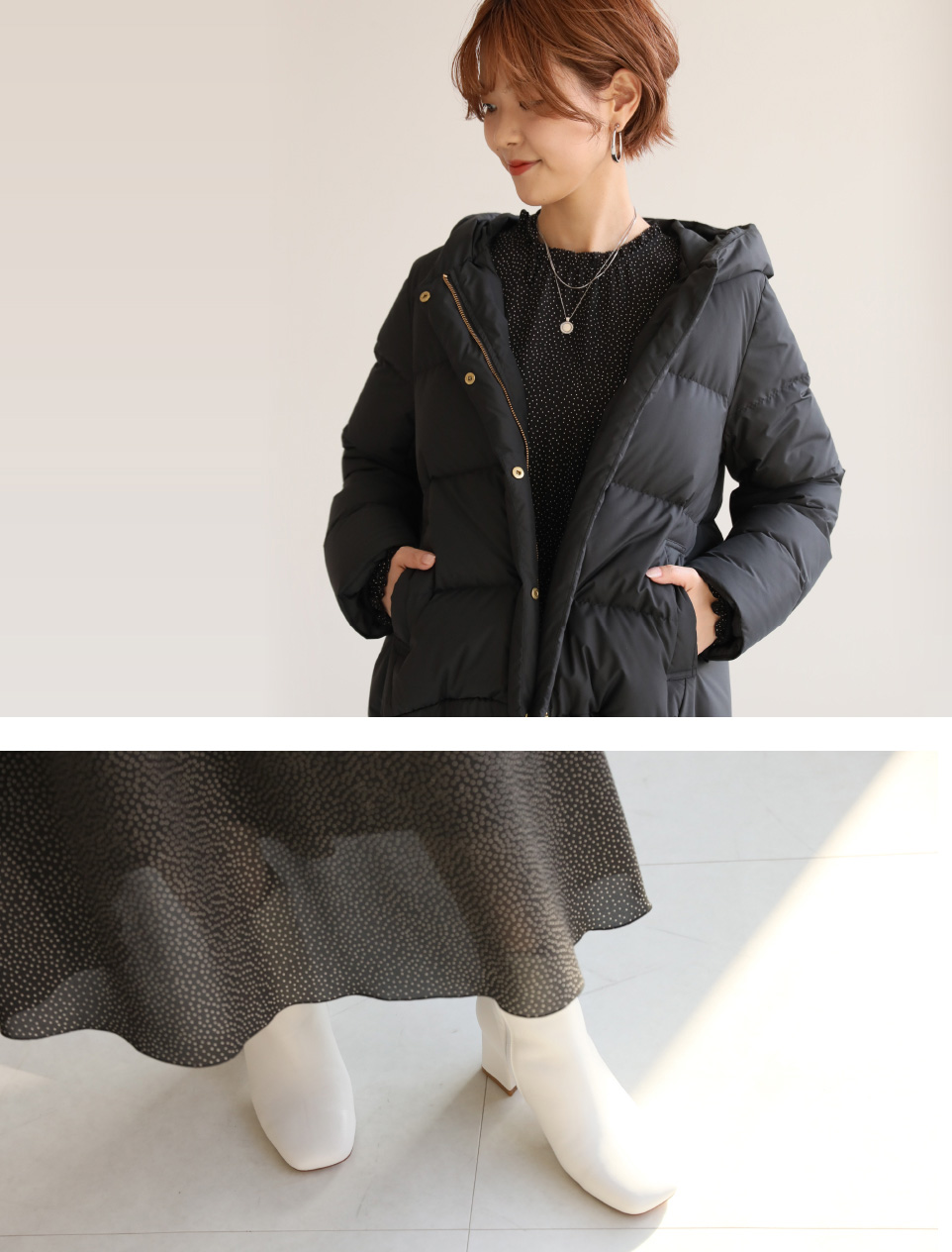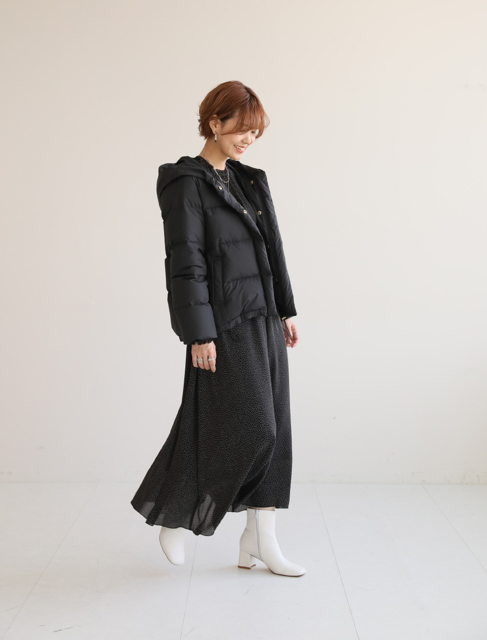 女性らしさが際立つドットワンピースにはコンパクトなサイズ感のダウンコートを合わせれば、甘くなり過ぎない大人のフェミニンスタイルが完成。