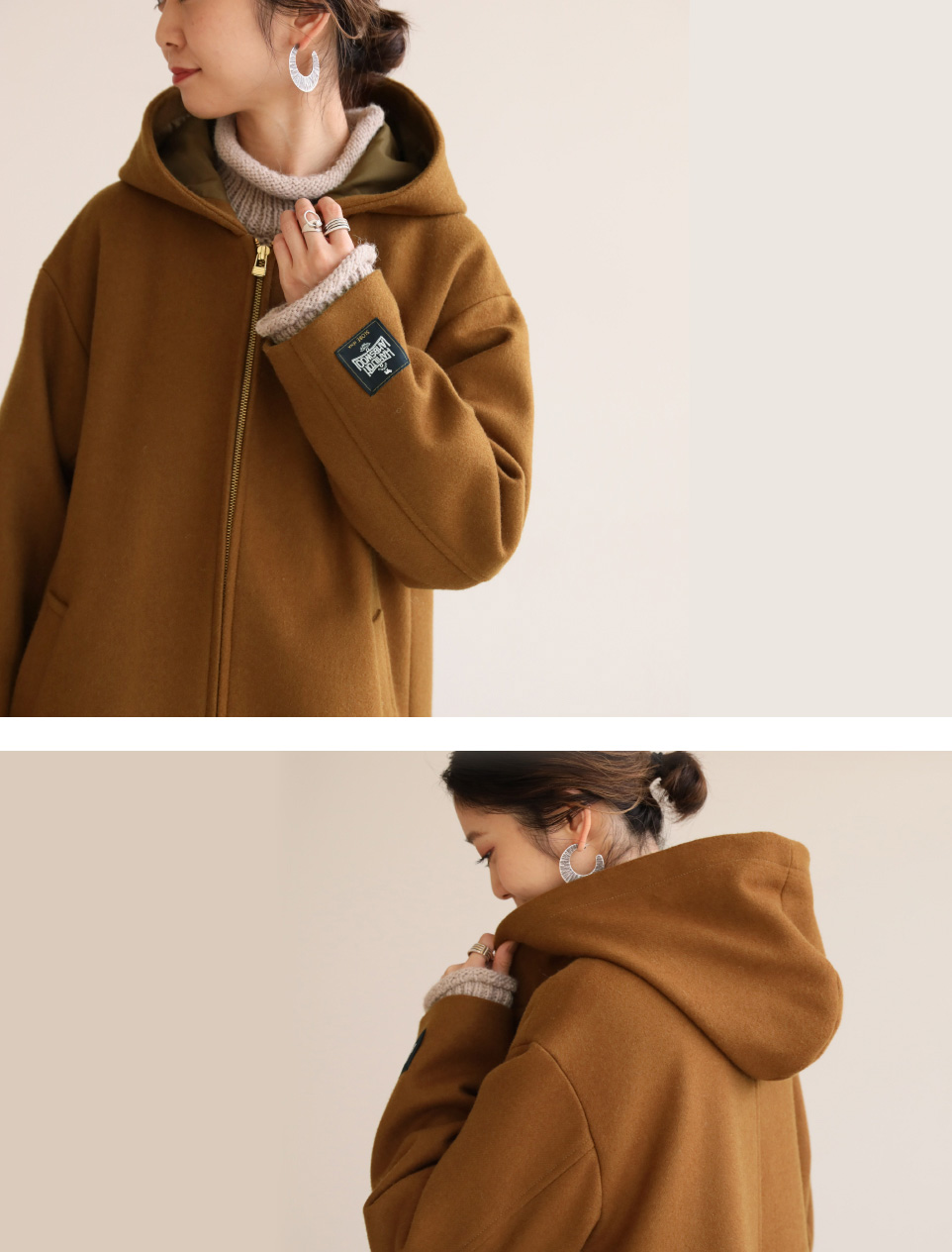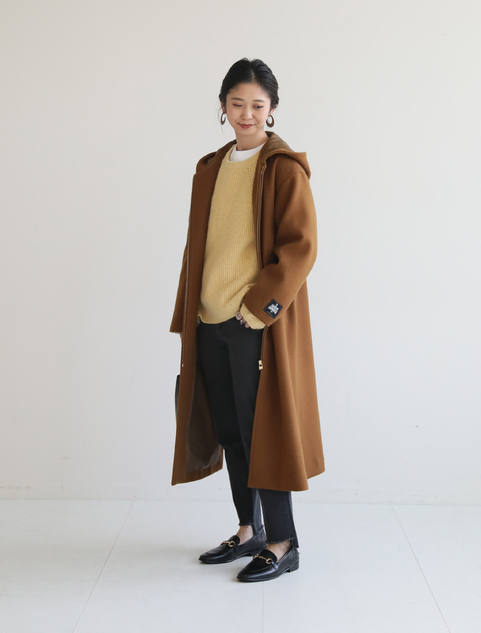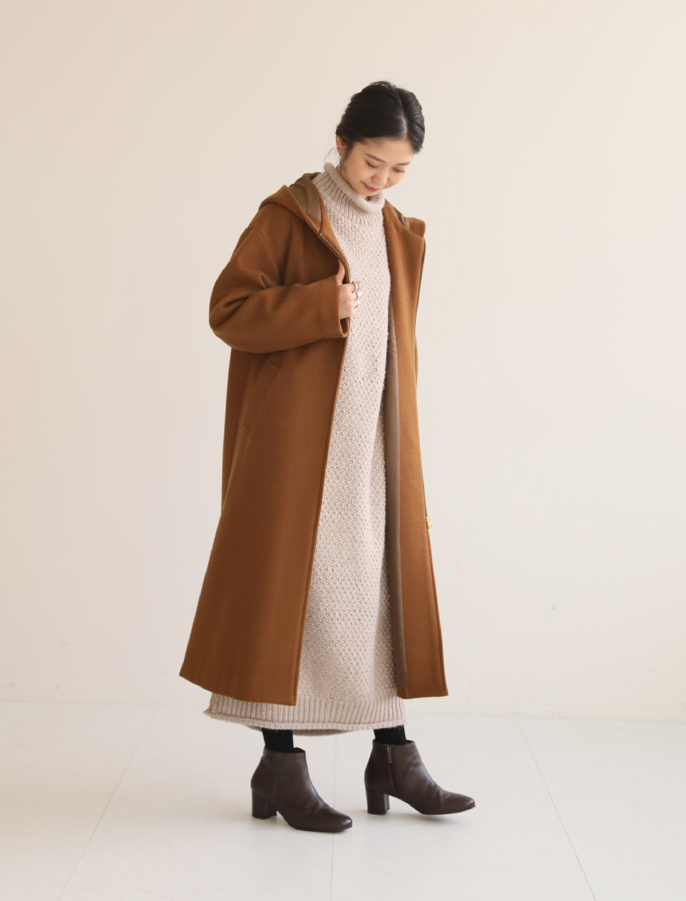ふっくらとしたウール素材のフードコートにニットワンピを合わせて程よく女っぽく。ランチ女子会にちょうど良いキレイめスタイルの出来上がり。