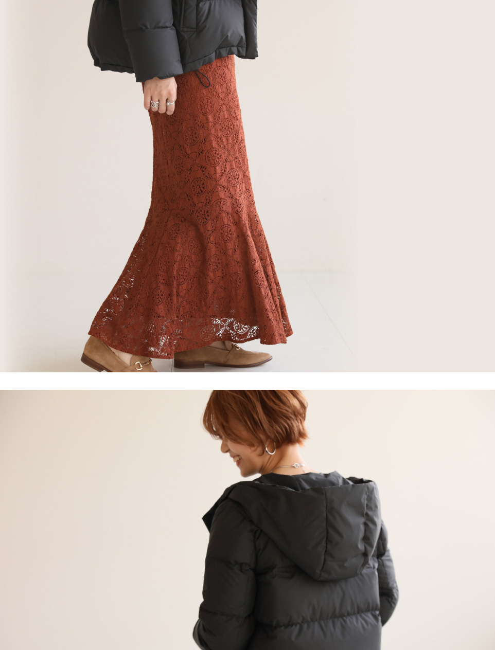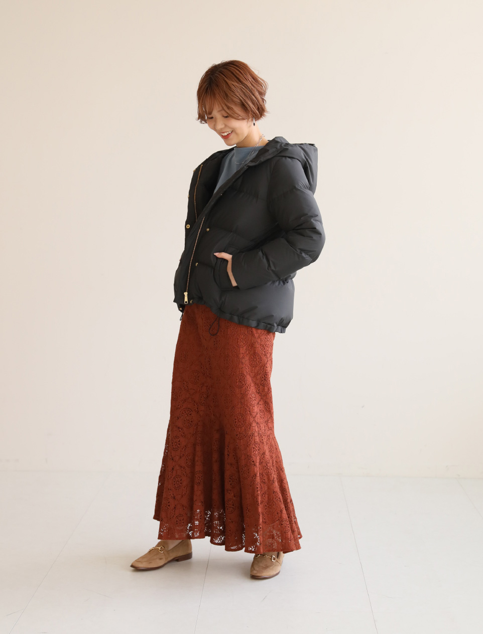 華やかなレースとマーメイドラインが目を引く主役級のスカートは、カジュアルなカットソーとダウンコートとともにエフォートレスに着こなしたい。