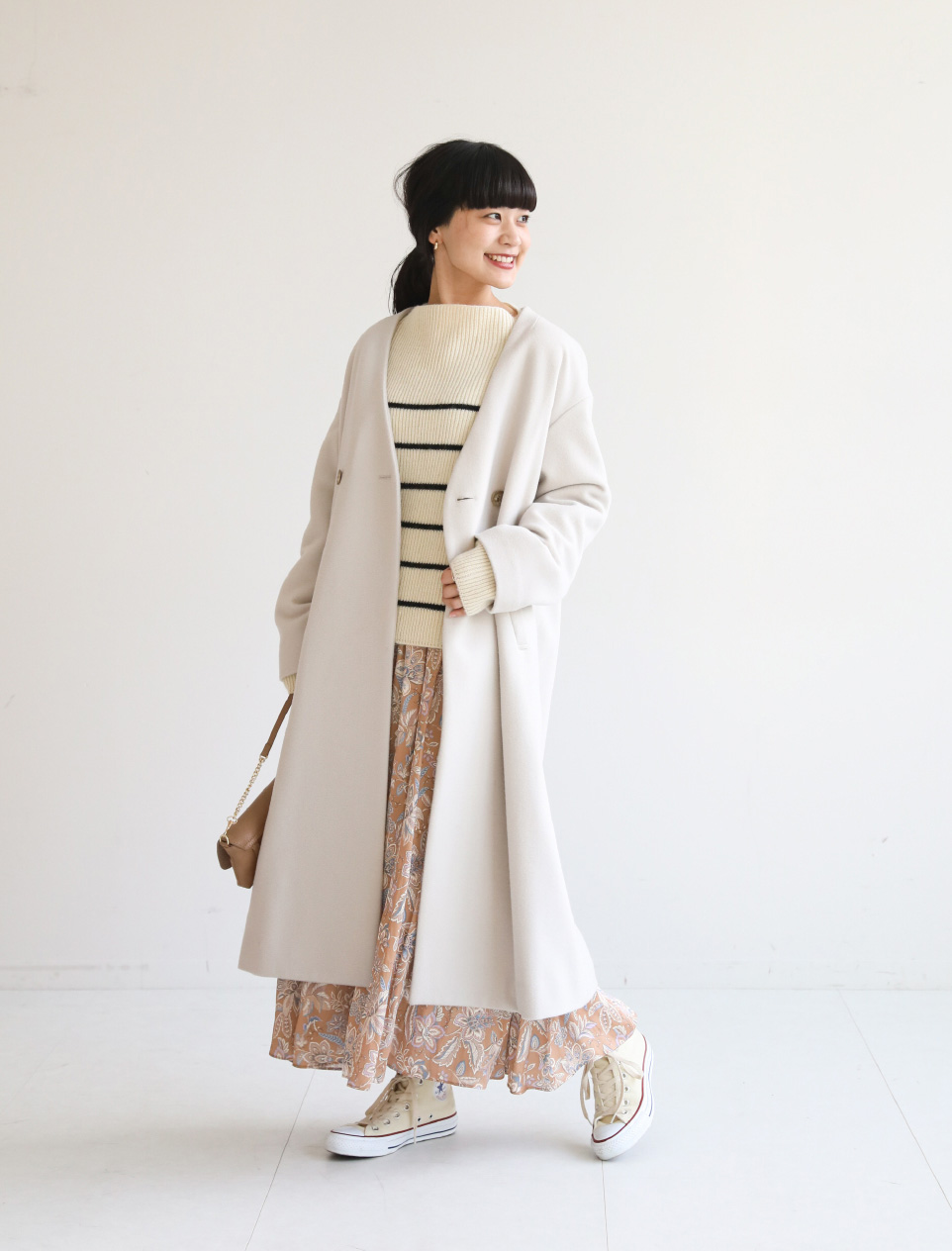 肩の落ちた丸みのあるシルエットのロングコート。ロング丈のスカートとも相性が良く、足元はスニーカーで「外し」を効かせればカジュアルデートにもぴったり。