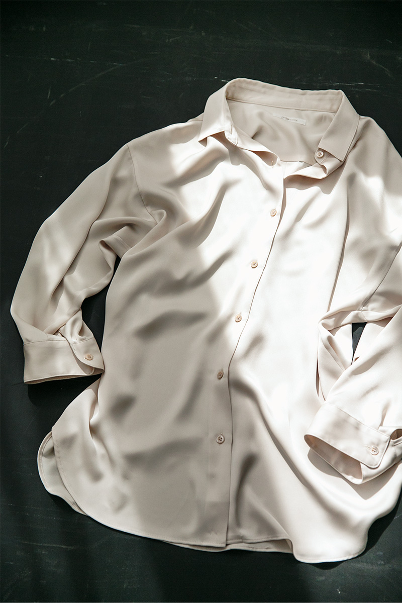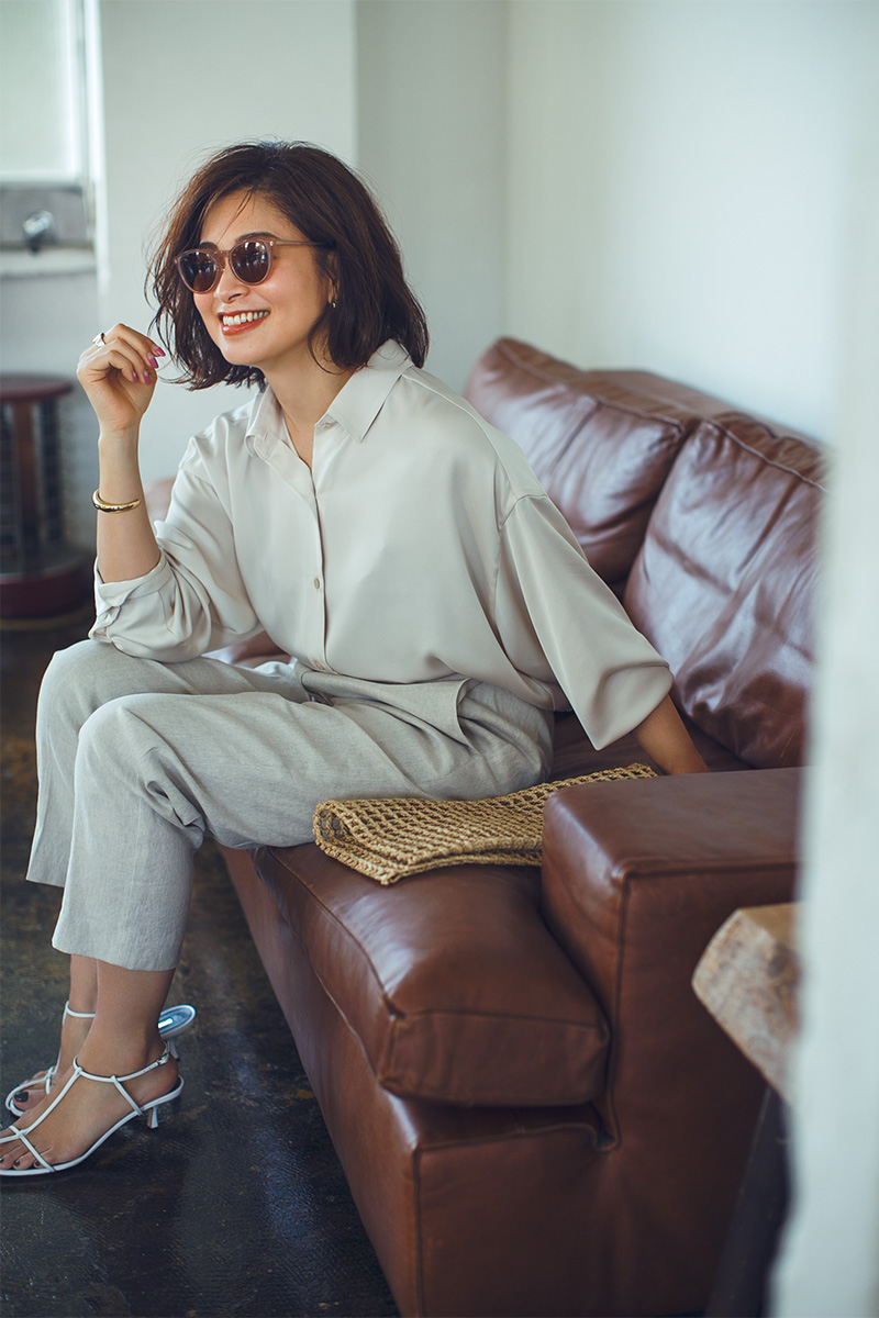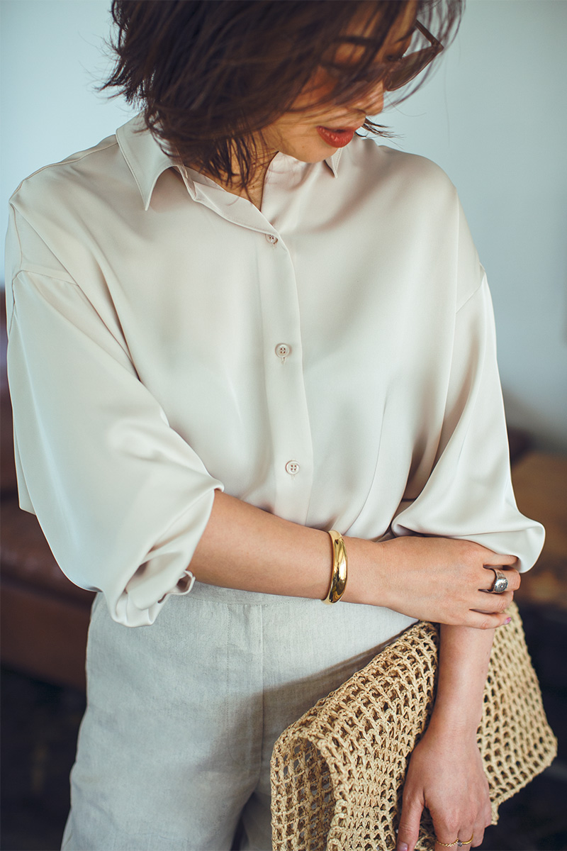 「見た目そのまま、着心地もとってもいいです。なめらかなのにさらっと肌離れがよくて。今から初夏まで快適に着られそう。サイジングも絶妙で、単なるオーバーシルエットじゃない、程よくゆるりと大人っぽいフォルム。女性の体が入ると、素材の陰影がきれいに出て上質感と色っぽさが際立ちます。一枚で十分主役として映えるシャツだから、同系色のリネンパンツを合わせてシンプルなスタイリングに。シルキーなとろみ素材とドライなリネン、素材感のコントラストを意識して」