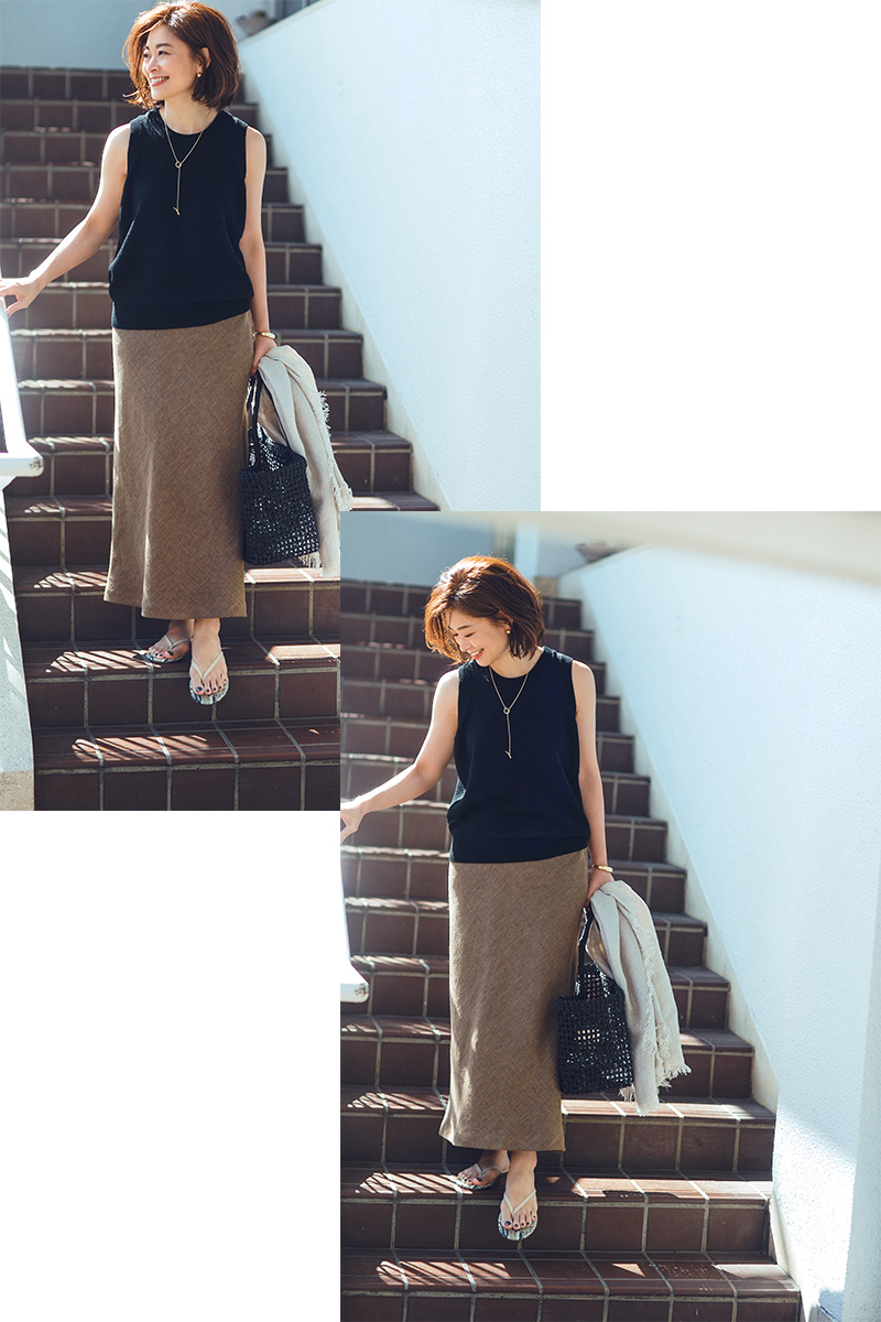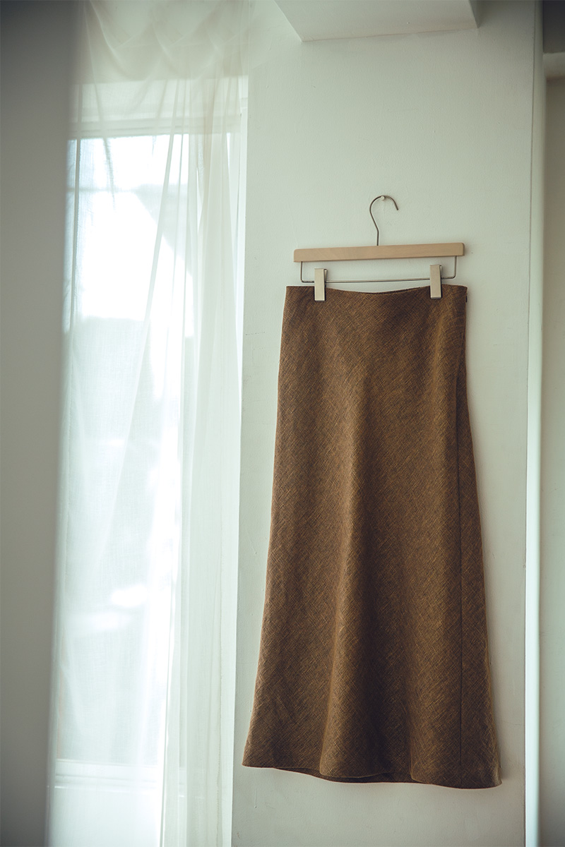 「フェミニンなロングスカートは、私のワードローブに欠かせないアイテム。昨年はふんわりしたギャザーシルエットをよく着ていましたが、今年はマーメイド型も新鮮ですね。大人っぽく洗練された雰囲気がつくれそうです。こちらはひと目で上質とわかる素材感にも惹かれました。麻とレーヨンの混紡で、ほんのりツヤとシャリ感のある織りの表情。イタリアのマダムが日焼けした素足ではいていそうなイメージ!かっこいい色気を感じます。」