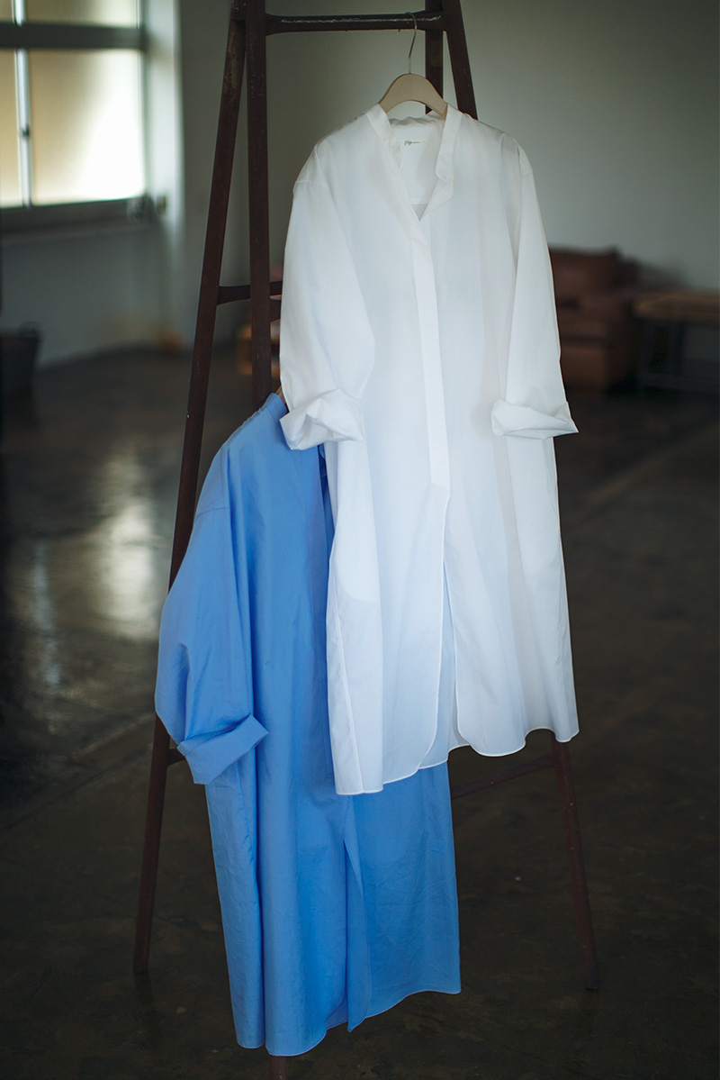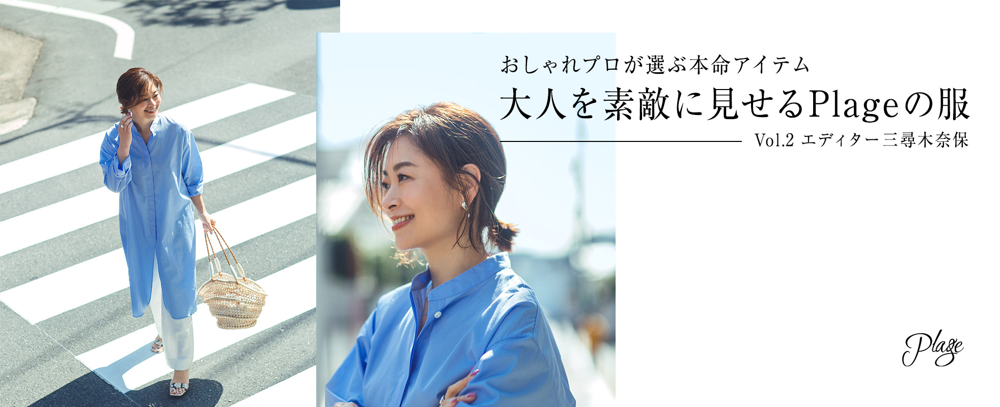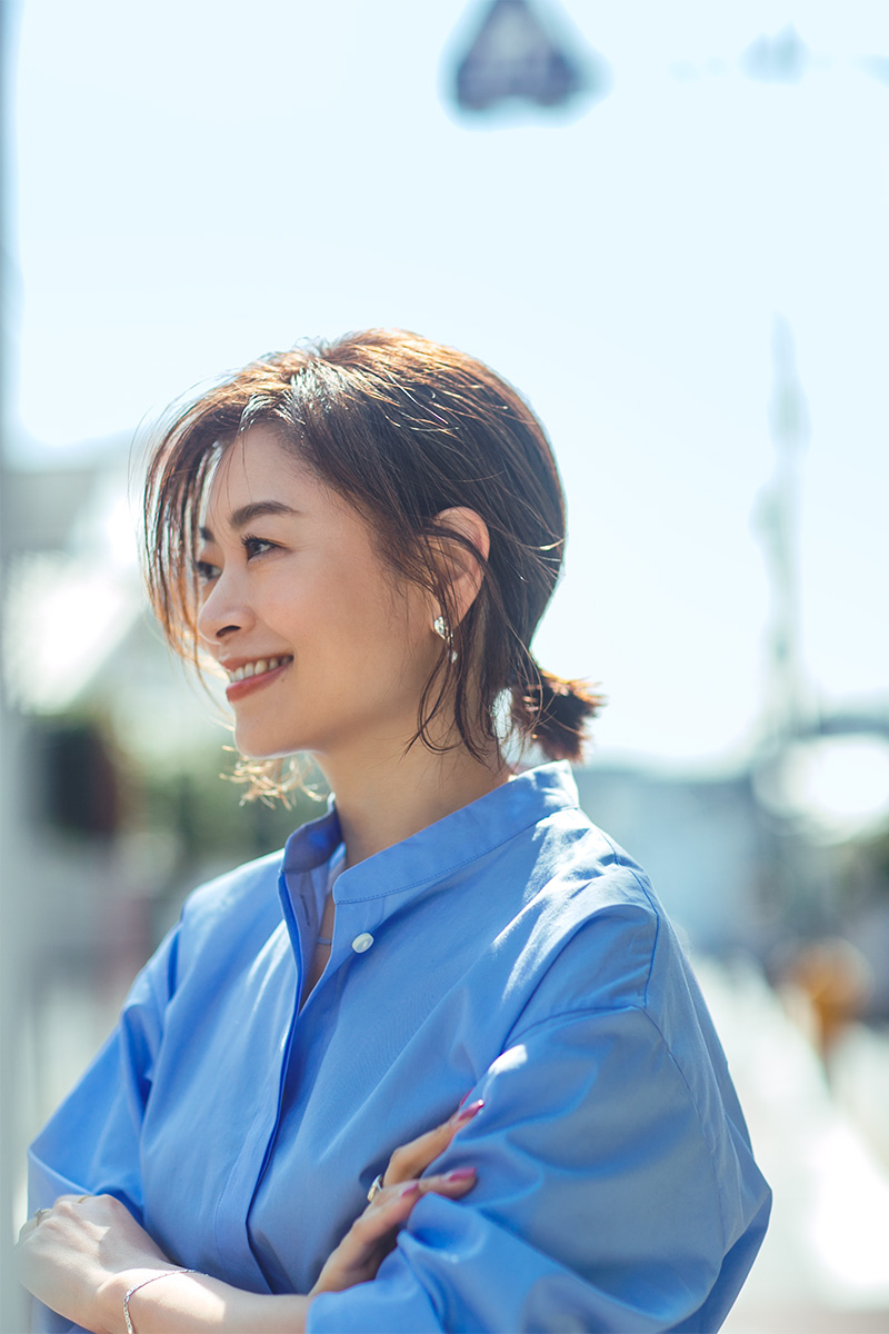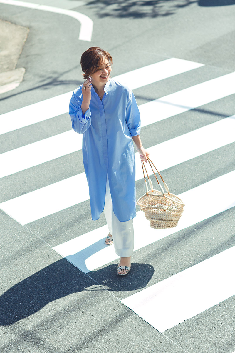 「クリーンなブルーシャツは今年のトレンドですね。白パンツを合わせて王道の爽やかな配色に。このシャツ、よく見ると前開きの途中から裾にかけてさりげないラウンドカットになっていて、大人のひねりが効いています。チュニック丈のシャツは体が大きく見えてしまうこともあるけれど、これなら自然と裾に抜け感が出て、すっきり着られますよ。比翼のバンドカラーも今どきの印象で、表情が締まります。」