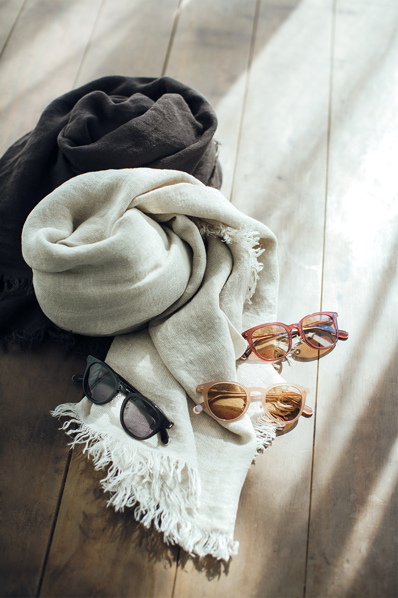 「ニュアンスカラーのリネンストールとサングラス。初夏気分を先取りできる小物は、今のうちにチェックしたい! ストールはリネンの中でも最も柔らかいフランダース原料を採用。さらっとしているのに、上質なカシミアのようにソフトで軽い肌触り。サングラスは日本発の【Mille】というブランドの別注だそう。日本人の骨格に合うサイズ感で、おおげさな感じにならないのが魅力です。肌なじみのいいピンクベージュやブラウンがおすすめ!」