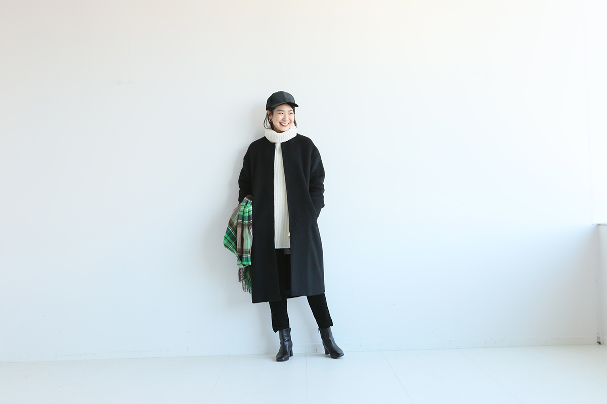 「長身さん」ならシャギーコートを主役にモノトーンでカッコよくまとめるのが今の気分。顔まわりは暗くならないよう白のタートルニットをインして、鮮やかカラーのチェックストールで差し色を入れて。ボトムはスリムパンツとショートブーツですっきりと仕上げたい。