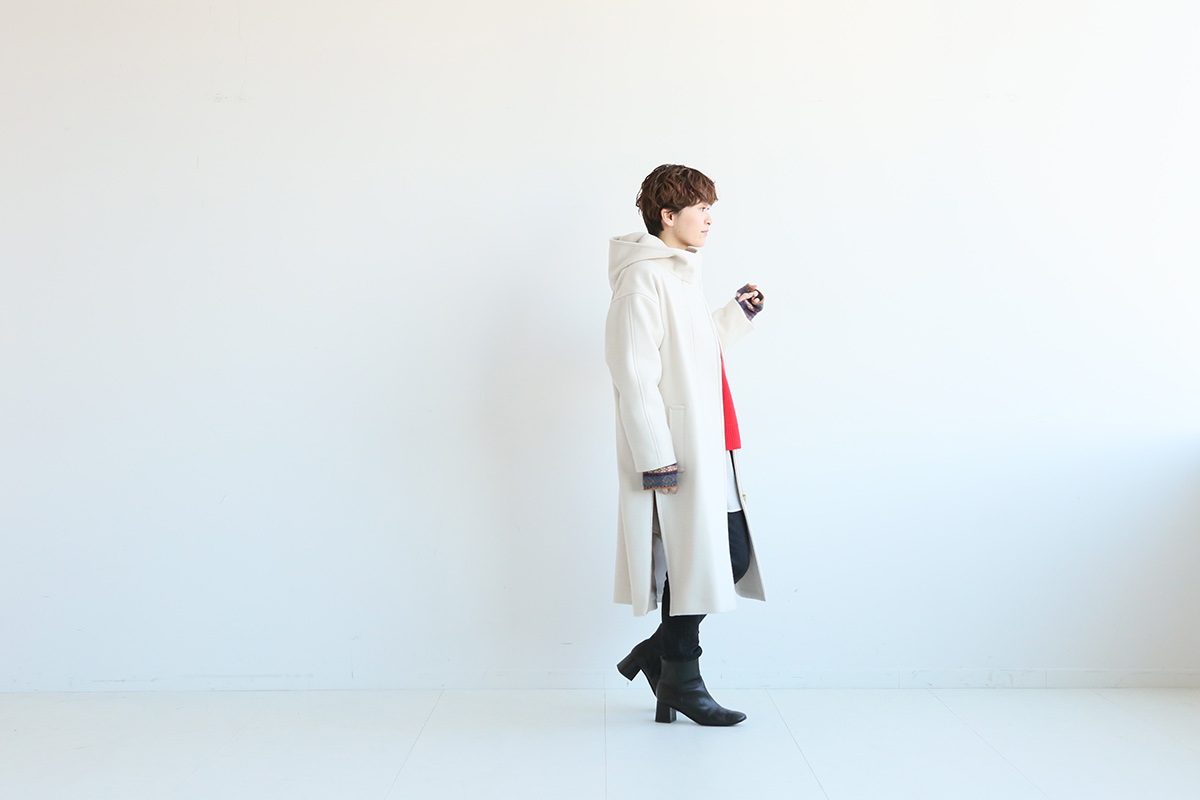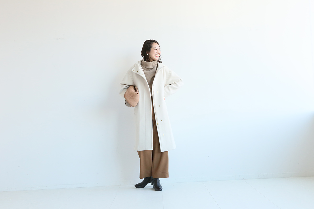 上質な素材感と程よいオーバーサイズできれい目からカジュアルまで幅広く着こなせるフードコート。イベントが多い冬はいつもより雰囲気を変えて、白のコートにベージュやキャメルなどの柔らかなカラーを合わせたお出かけスタイルで気分を上げて。