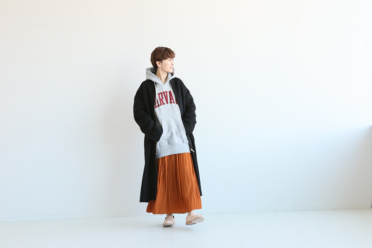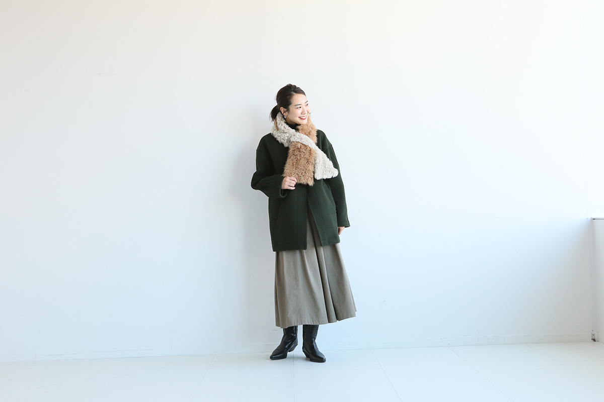 「長身さん」のスカートスタイルはショート丈のコートとバランスが取りやすい。どんなテイストにも着回しが効きやすいから冬のヘビロテアイテムになりそう。着心地が軽いのでボタンを締めてしっかり着こなすのもオススメ。