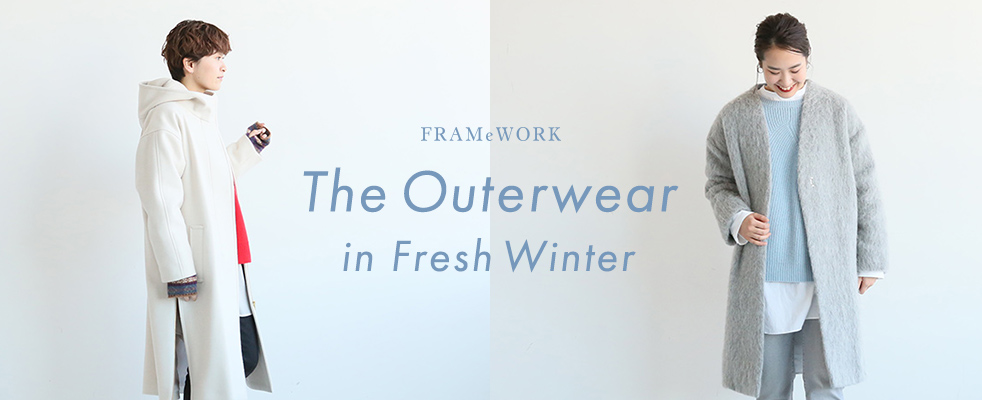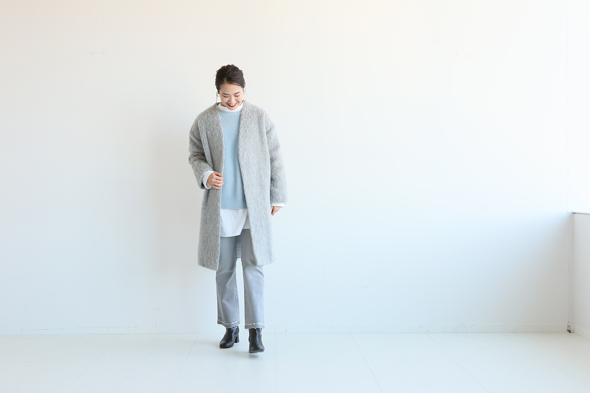 例年ならグレーのコートには黒のアイテムを合わせるところを、この冬は明るいトーンでまとめるのが気分。アイスブルーのニットとグレーコートの組み合わせはFRAMeWORKスタッフもお気に入り。コートの中はシャツをチラ見せするレイヤードスタイルが今年のイチオシ。