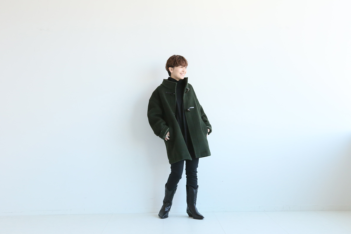 深いカーキが大人のカジュアルを演出してくれるダッフルコート。コートを主役にしたい日は中のアイテムやシューズはシンプルに黒で統一したい。ショート丈のコートなら「小柄さん」もバランスよく自然なムードに着こなせる。