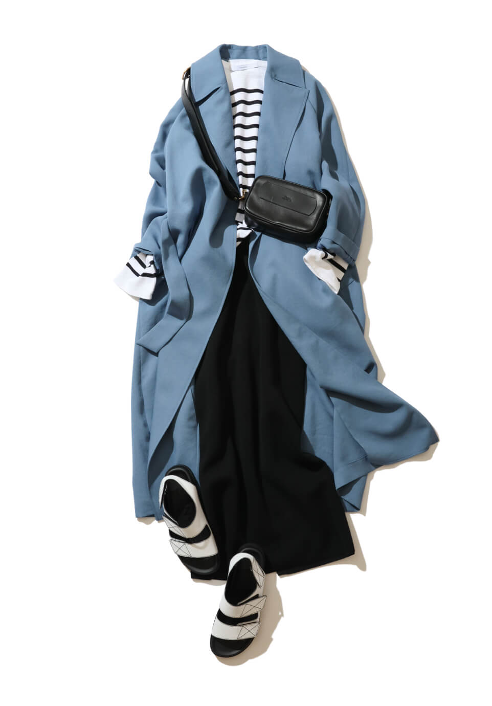 春空に映えるサックスブルーのラップコートは、バサっと羽織るだけでかっこいいスタイルが即完成。ボーダートップス×ニットスカートのスタイリッシュな大人カジュアルの上に合わせて、今年らしくアップデートを。シューズはあえてヘルシーさと抜け感を醸すベルクロサンダルが◎