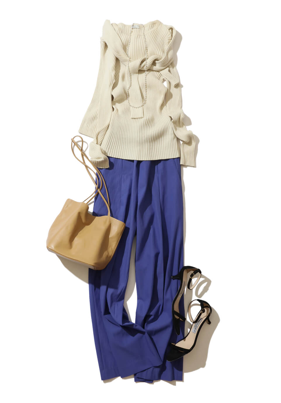 鮮やかな発色が抜群に今っぽいカラーパンツが主役。合わせるアイテムはモノトーンとベージュにまとめて、大人っぽく引き立てるのがポイント。白のリブニットアンサンブルは、クリーンなムードだけでなく上質素材ゆえのリュクス感が洗練の装いに格上げしてくれます。
