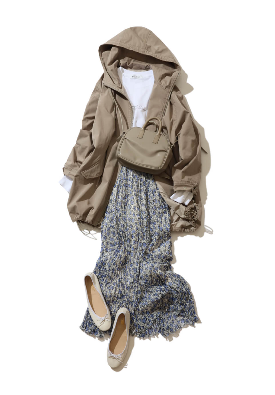 レトロでアンニュイな雰囲気のフォトプリントロンTに、春らしいエアリーな軽さが魅力の花柄プリーツスカートをMIX。こなれ感と女っぽさが絶妙なバランスの垢抜けフェミニンコーデには、フーディブルゾンをふんわりと羽織ってヘルシーに。足元はスニーカーではなく白バレエで軽さをプラス。