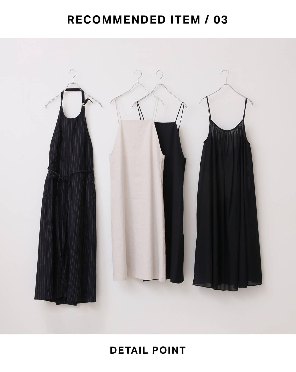 春に大活躍のキャミワンピースは、着回しの効くベーシックなモノトーンを。素材が軽いので、ブラックでも重たくなりすぎずに着こなせます。シンプル&クリーンなリネン混素材のエプロンワンピースは、キャミよりもヘルシーな雰囲気に仕上がって今っぽい。 - Plage【JANE SMITH/ジェーンスミス】HALTERNECK APRON ワンピース◆¥46,200(税込)