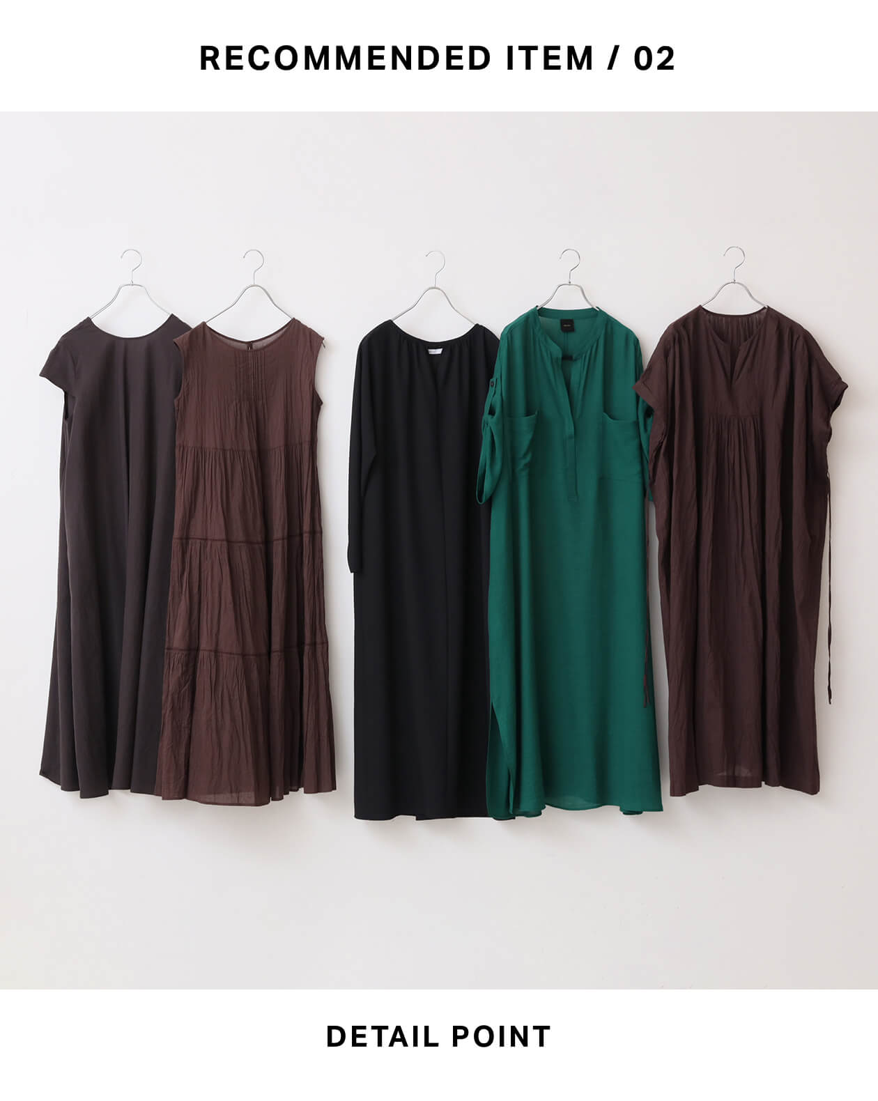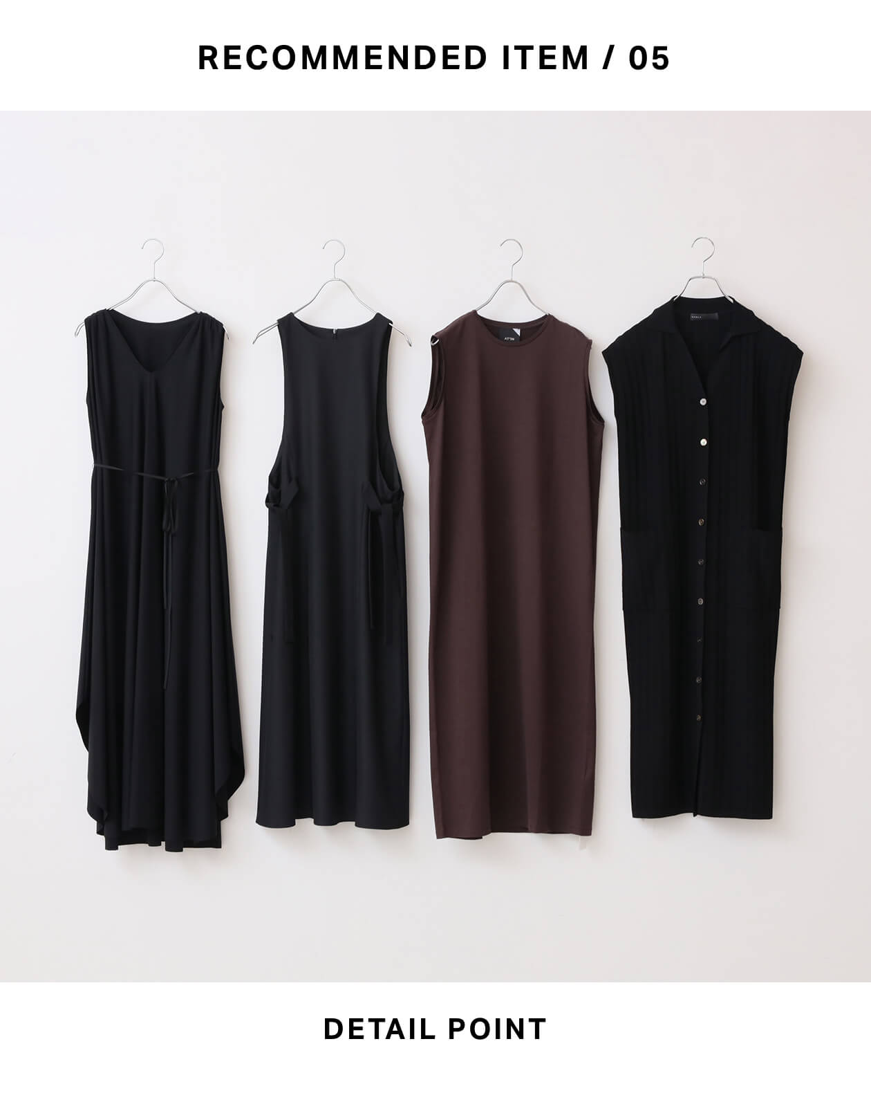 シンプルなノースリーブワンピースは着回しのきくブラックやブラウン見えするパープルがおすすめ。濃いブラックはシックに、赤みの強いパープルは女性らしい印象に。ATONのストレートワンピはシンプルながら品が漂う光沢素材と計算されたシルエットが魅力。アクセサリーや小物で遊びを効かせて。 - VERMEIL par iena【Seagreen/シーグリーン】ドレープ ノースリーブ ワンピース◆¥28,600(税込)
