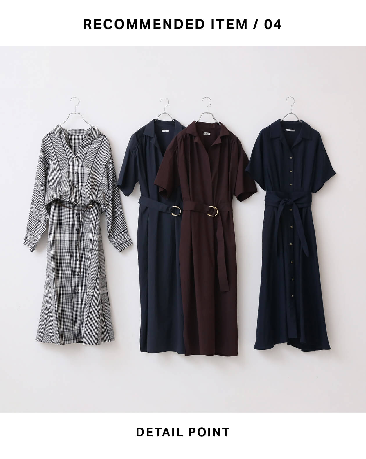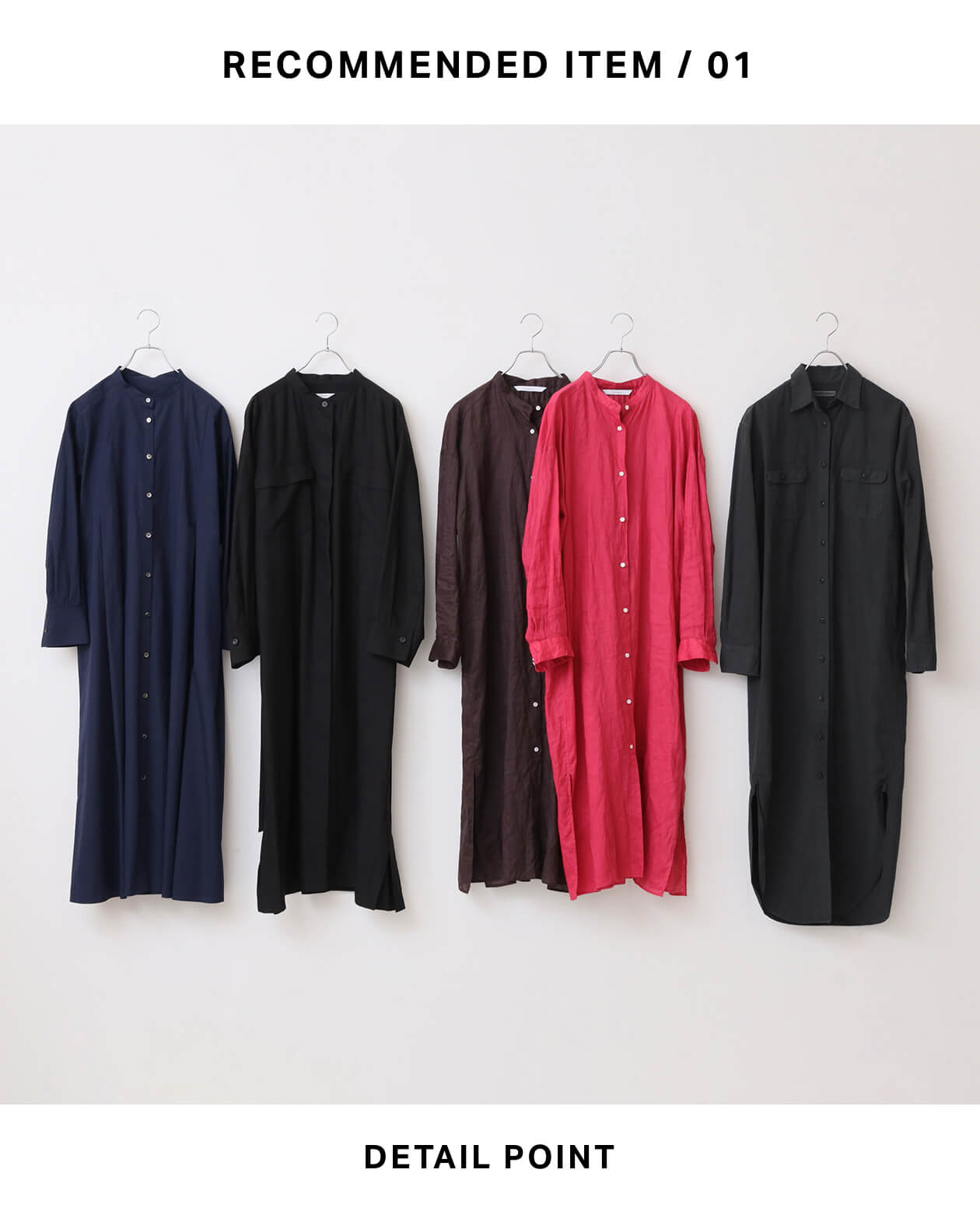 春夏に活躍するシャツワンピースはベーシックカラーと差し色、どちらを持っていてもGOOD。定番のブラックやグレー、ネイビーはもちろん、ピンクやブラウンは明るさのある色味で季節のムードにもぴったり。バンドカラーをかっちり上まで閉めて端正にまとめてもよし、ドライなリネンで抜け感を加えてもよし。 - JOURNAL STANDARDタイプライターバンドカラーロングワンピース¥17,600(税込)