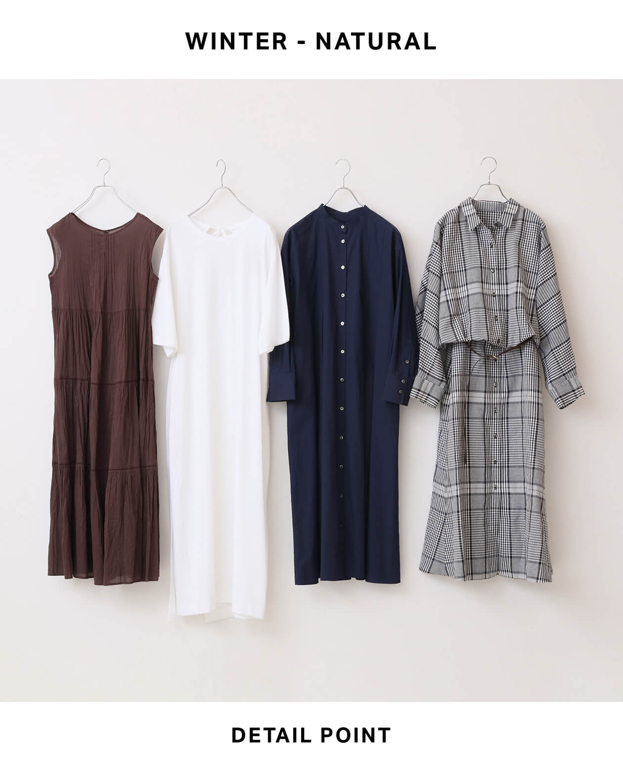 リラックス感のあるコーデが得意なナチュラルタイプは、ロング丈のワンピースをさらっと着こなすスタイルが春夏のおすすめ。チェック柄やティアードデザインのワンピースなら、カジュアルムードの中に女性らしさも感じさせる装いに。JANE SMITHは背中のカシュクールデザインがレディな抜け感をプラス。 - JOURNAL STANDARD relumeコットンボイルクリンクルティアードワンピース◆¥9,460(税込)