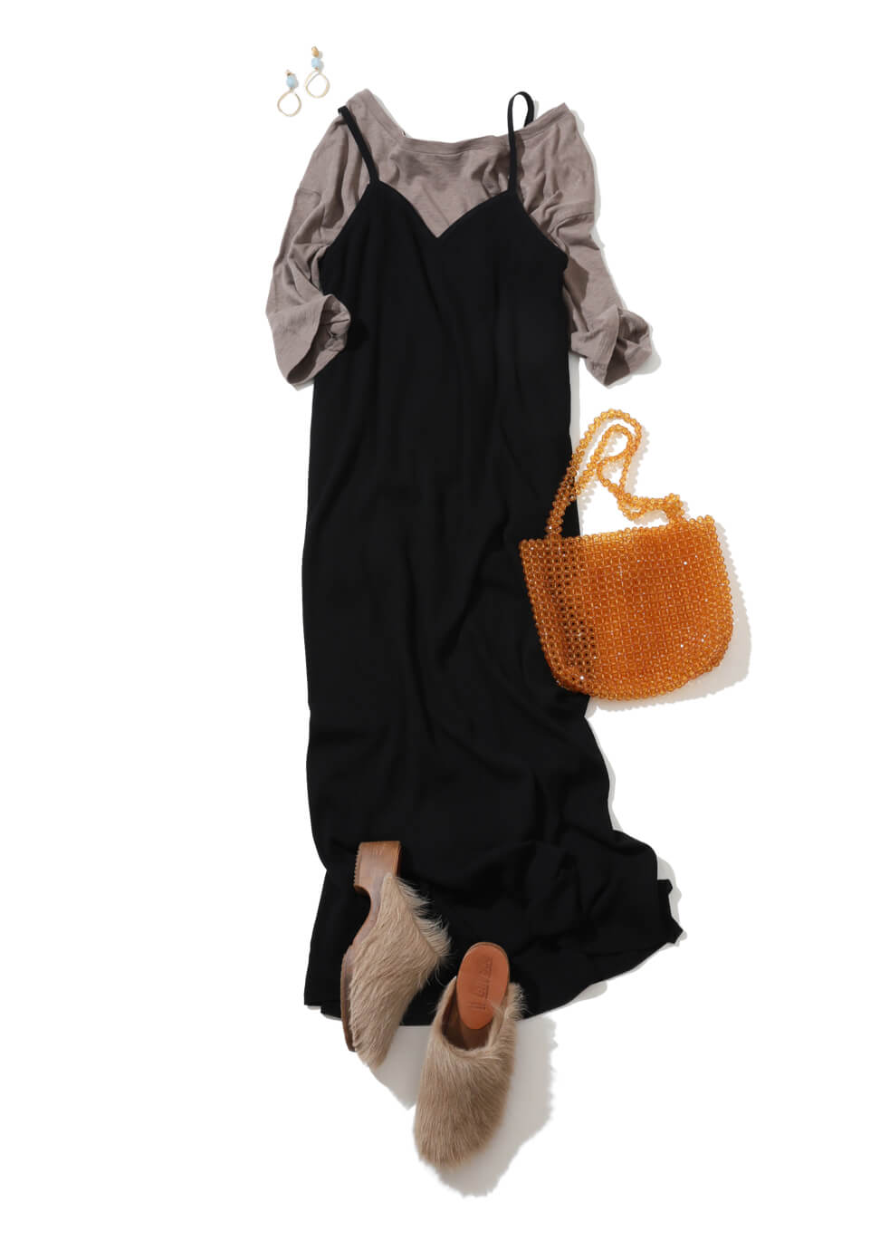 シックなブラックのキャミワンピは、カジュアルにもキレイめにも転ばせられる便利な1枚。インナーに気を配れば、季節の変わり目のスイッチアイテムとして今の時期に最適。夏の終わりはクスベージュの5部丈カットソーをイン。片方の肩をラフに落として、ワンショル風にこなれた着こなしにトライ。足元はハラコのサボで秋らしく。