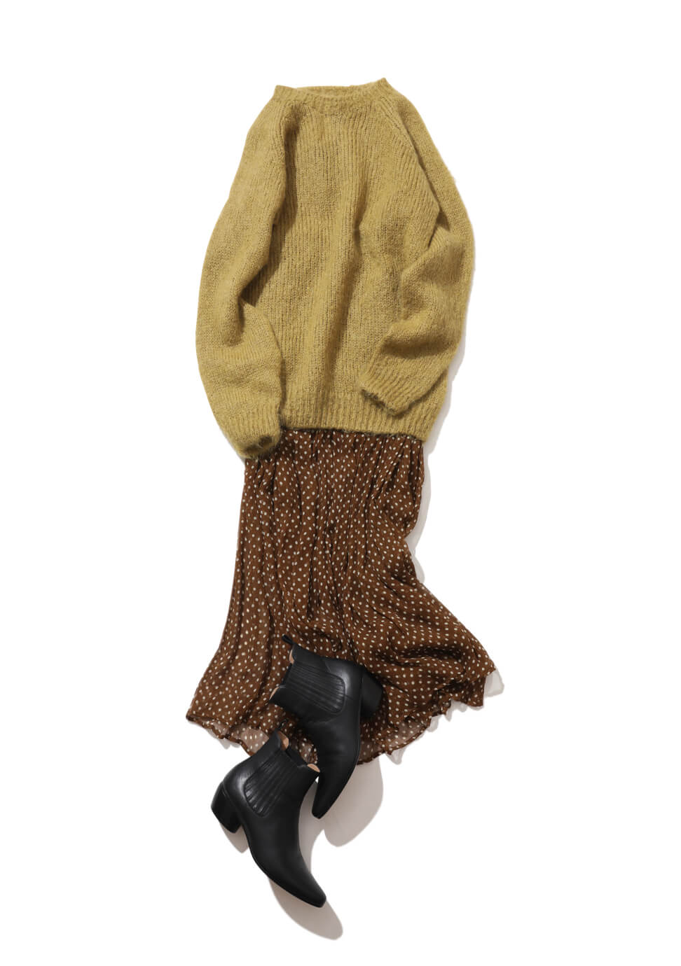 春夏からワードローブで活躍している、ドット柄マキシスカート。どこか懐かしいニュアンスのヴィンテージライクな風合いが、この秋冬も重宝しそう。甘く転ばせないように、これからのシーズンはニットでハズすのがオススメです。シンプルなシェットランドウールのカントリーニットとなら、甘辛バランスも取りやすい。黒ブーツで大人っぽく仕上げて。