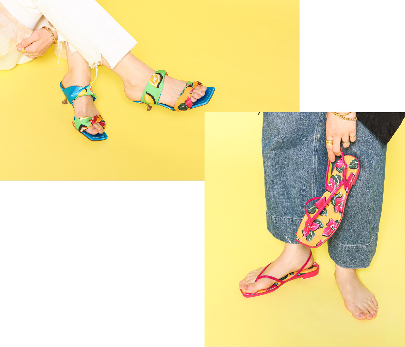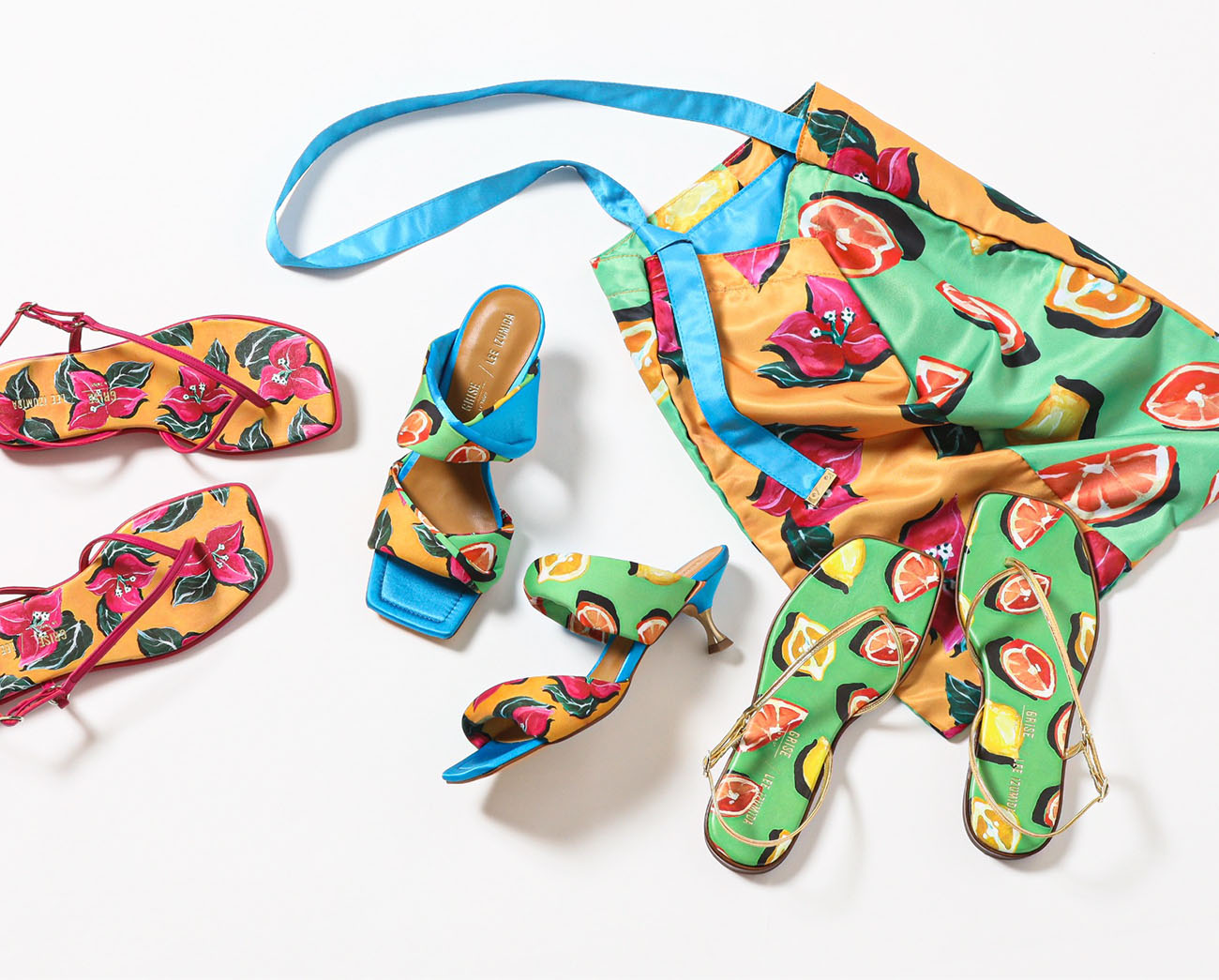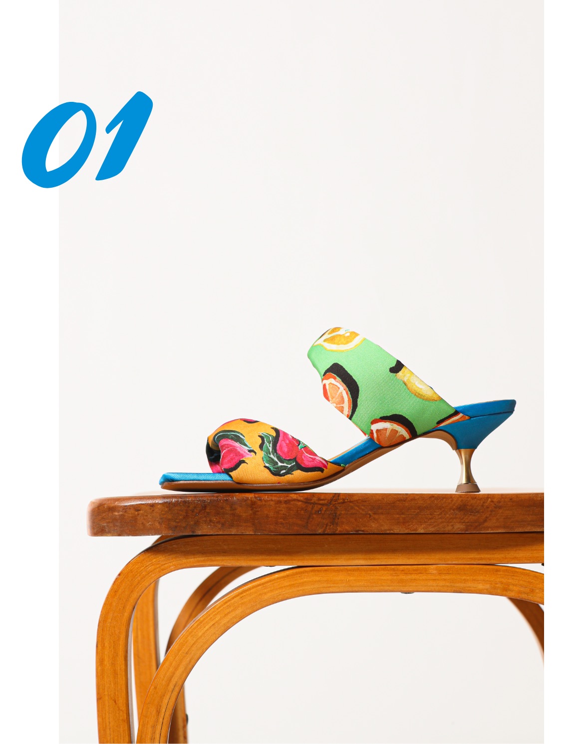 - 真夏の強い陽射しに映える鮮烈なミュールサンダルは、IZUMIDAさんこだわりのクレイジーパターン。マットサテンの質感と端正なヒールの表情が、プレイフルな中にモードなメリハリをプラス。