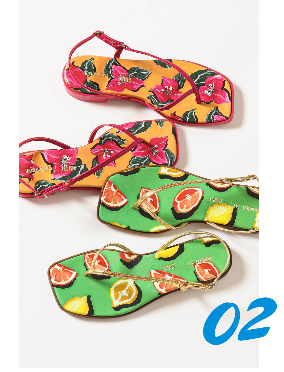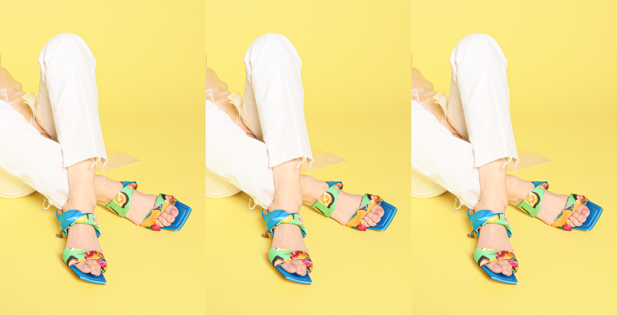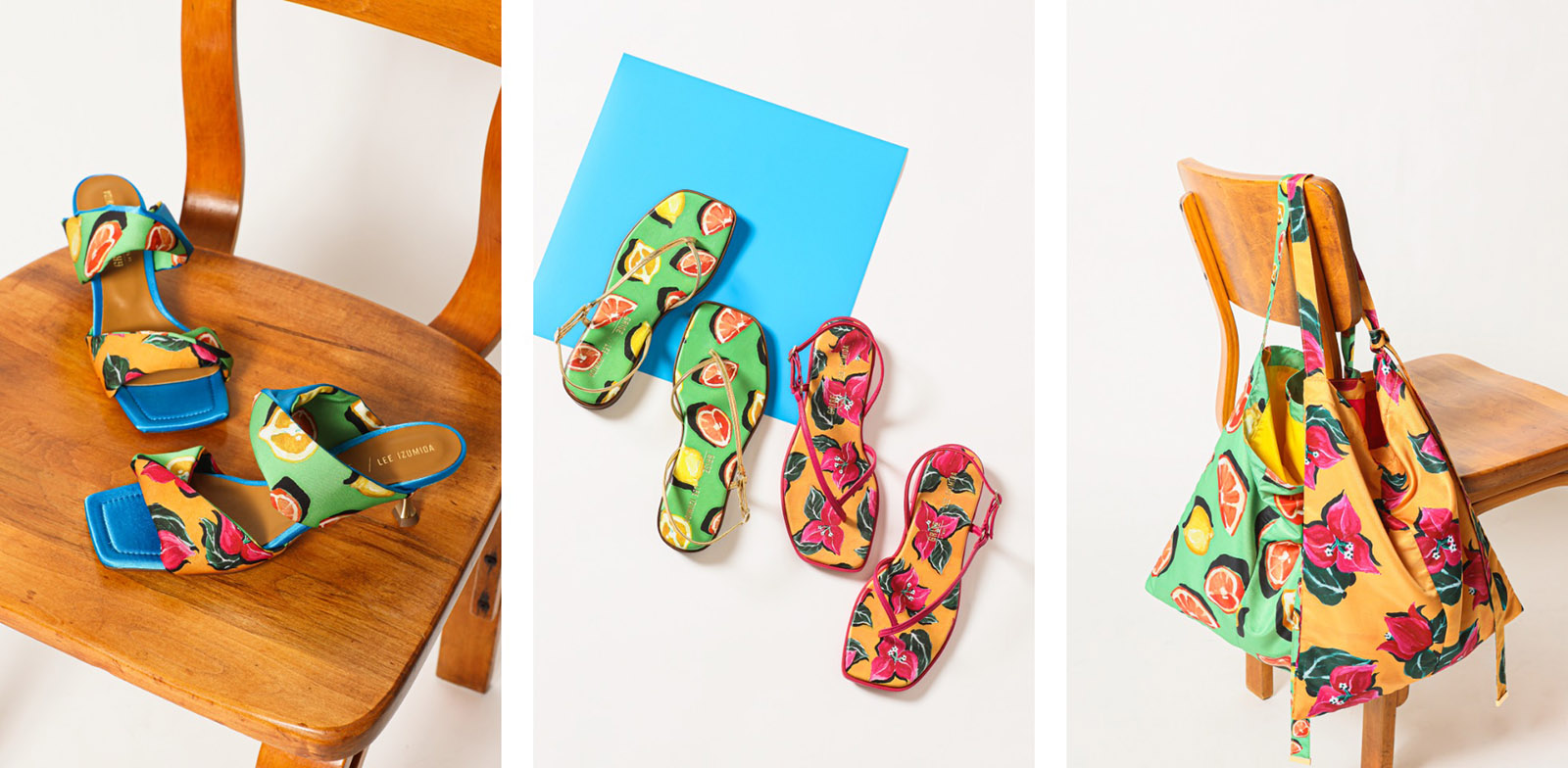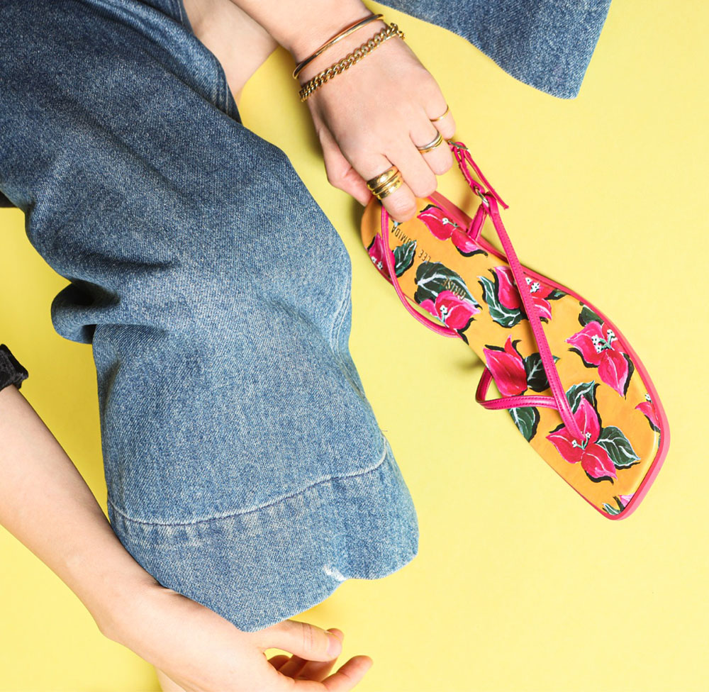 - 真夏の強い陽射しに映える鮮烈なミュールサンダルは、IZUMIDAさんこだわりのクレイジーパターン。マットサテンの質感と端正なヒールの表情が、プレイフルな中にモードなメリハリをプラス。