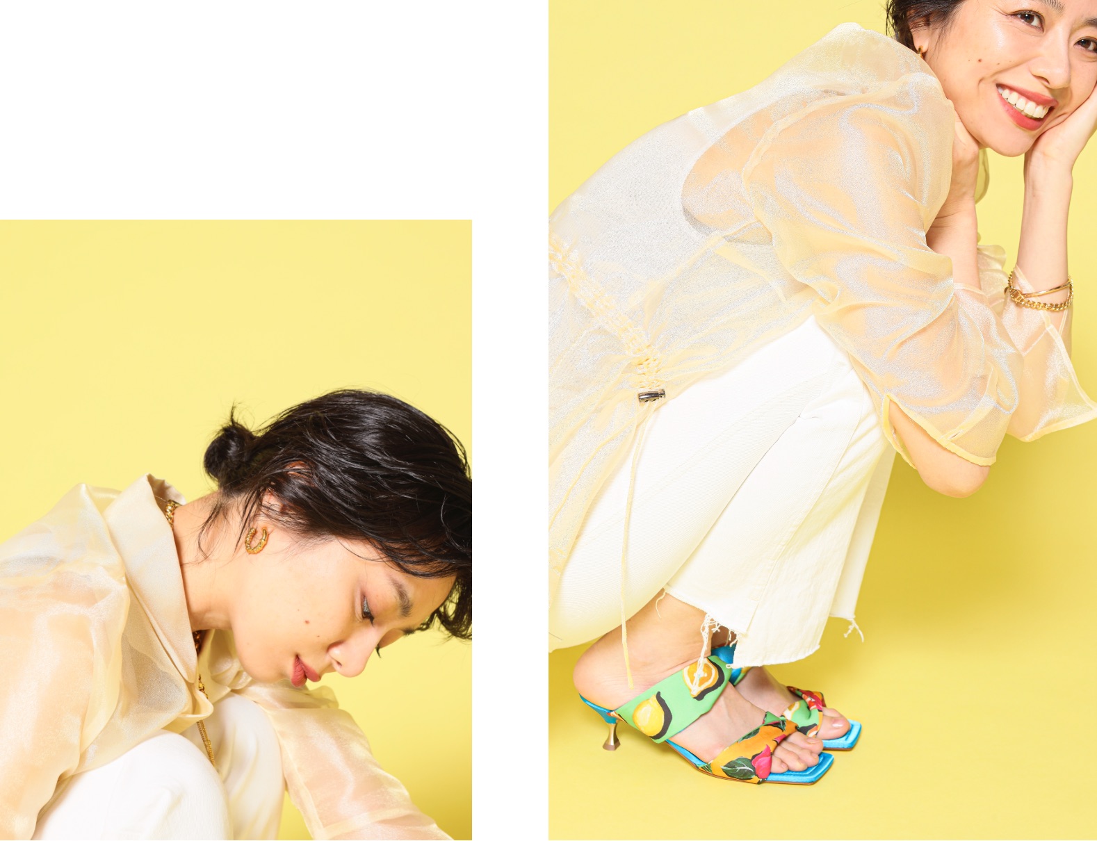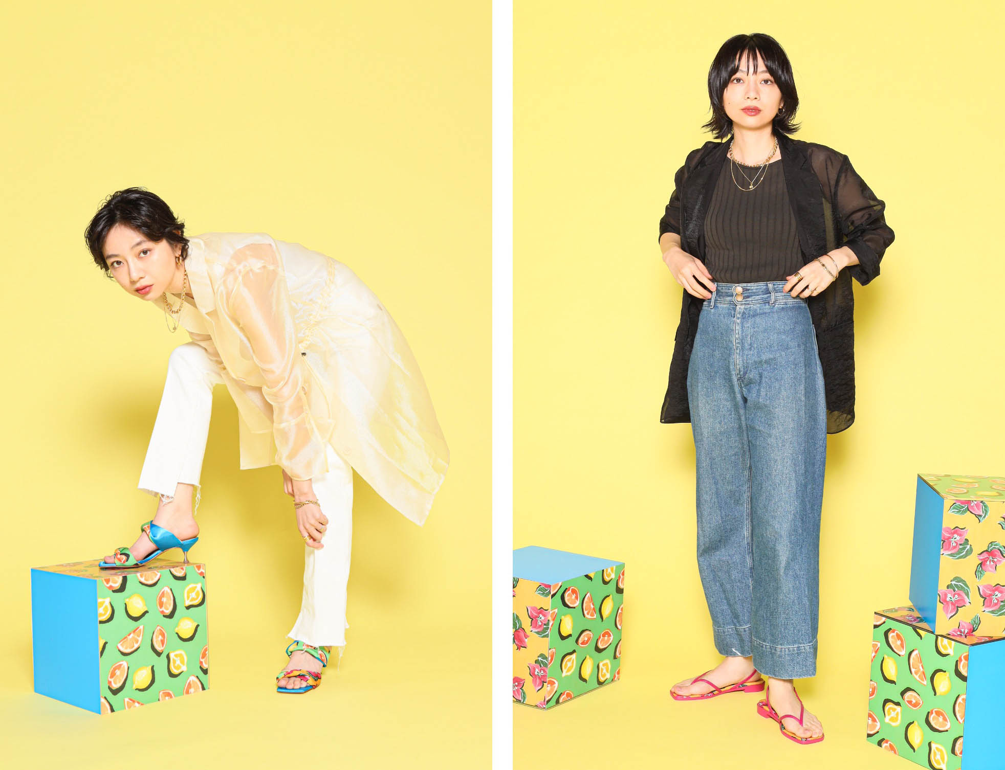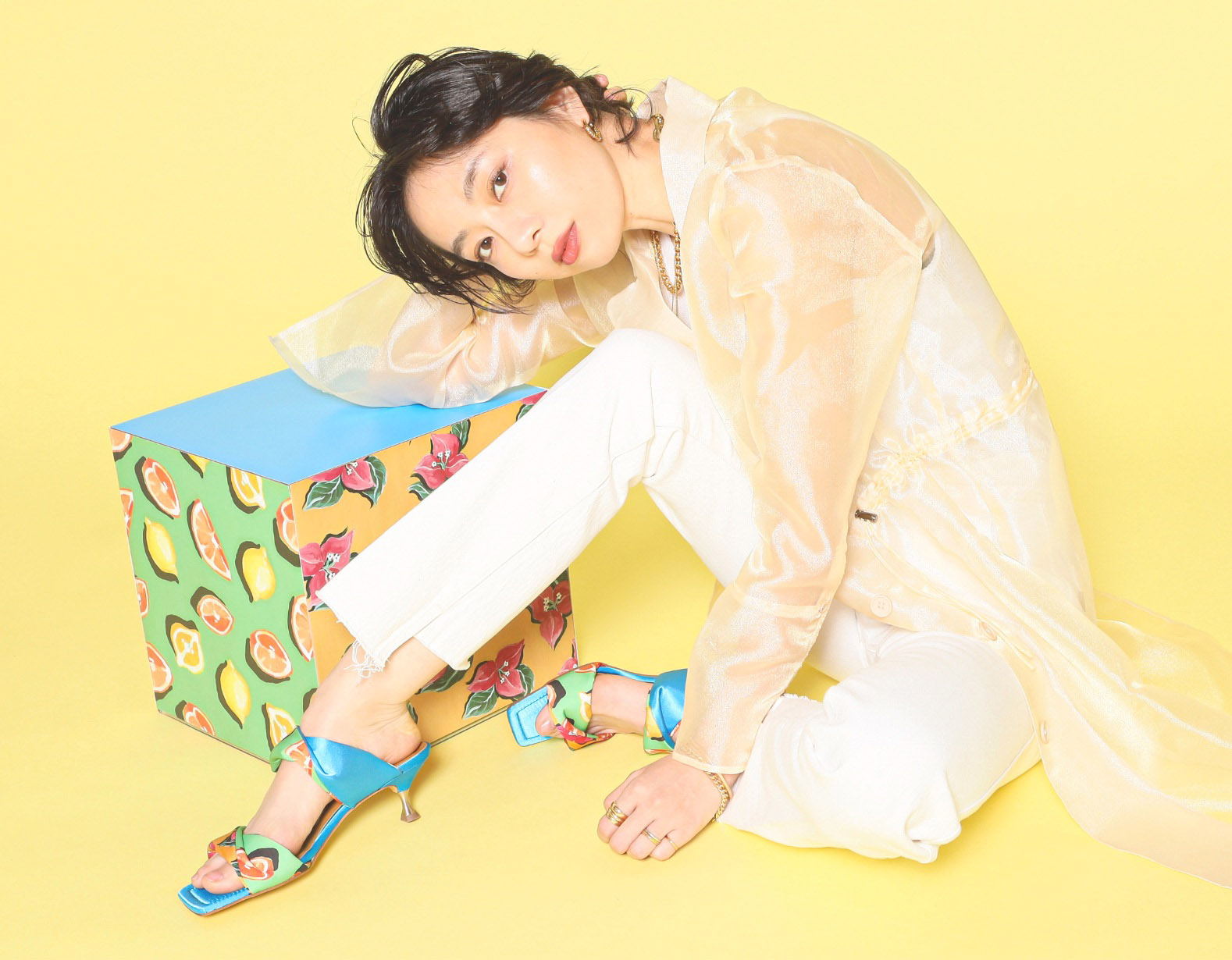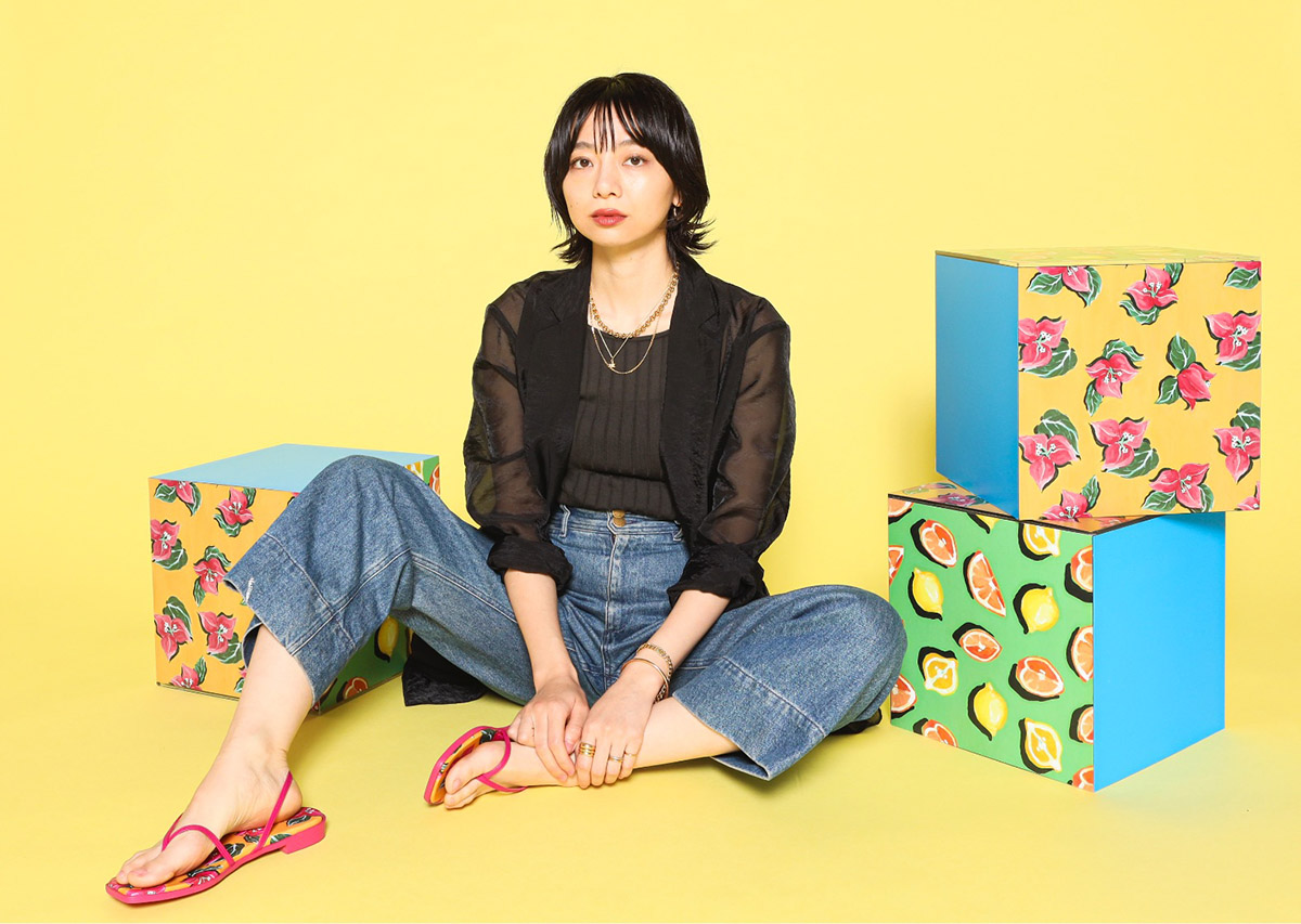 はい、シューズは今回が初めてです。実は、以前からやってみたいと思っていたアイテムだったのでとてもうれしいです。シューズって、思い切っていつもと違うチャレンジをしやすいアイテムだと思っていて。例えば私は普段、ピンクの服はあまり着ないのですが、シューズだと抵抗なく取り入れられたり。今日もピンクを履きましたが、占める面積が小さくなるサンダルであれば尚更遊びの幅も広がりますよね。