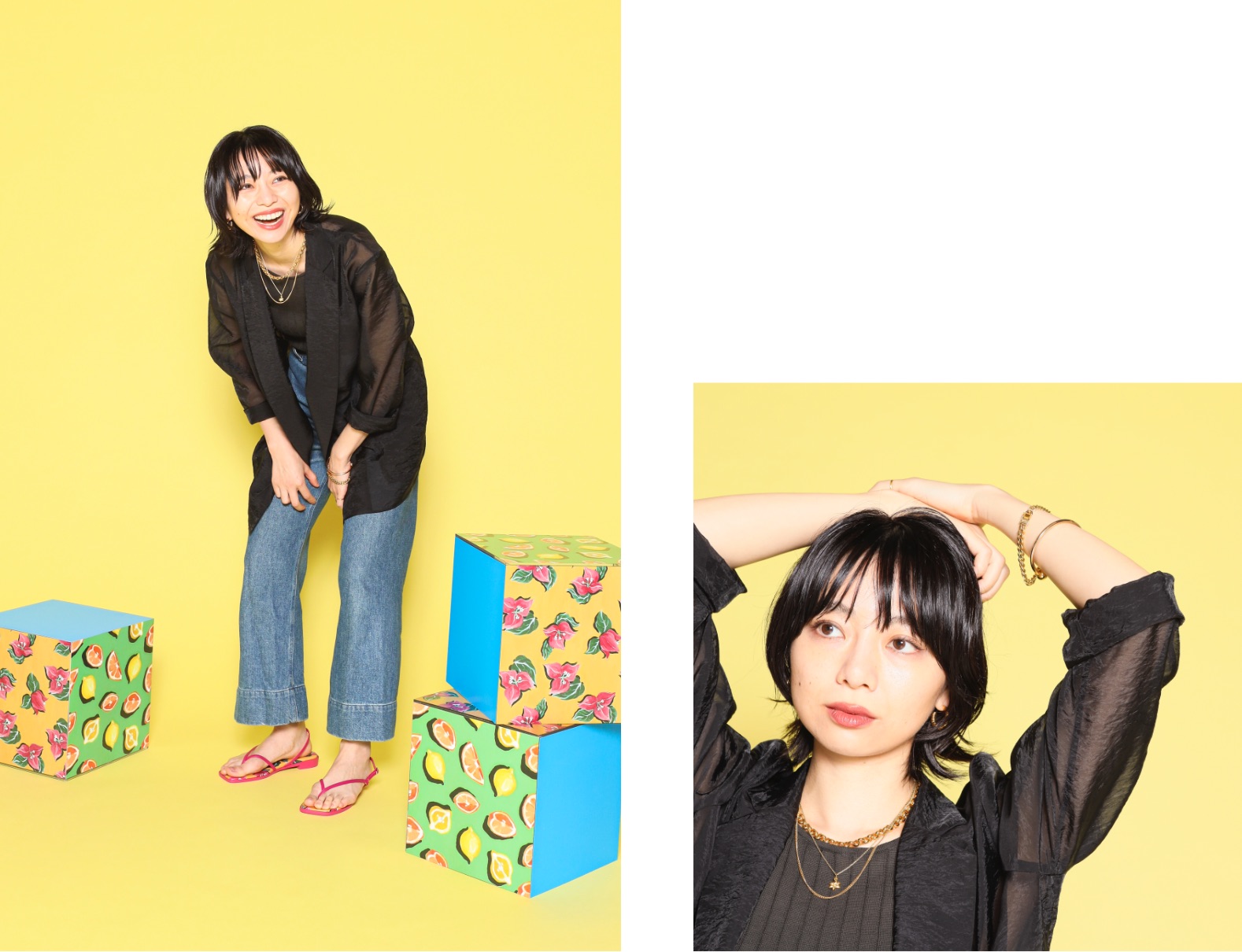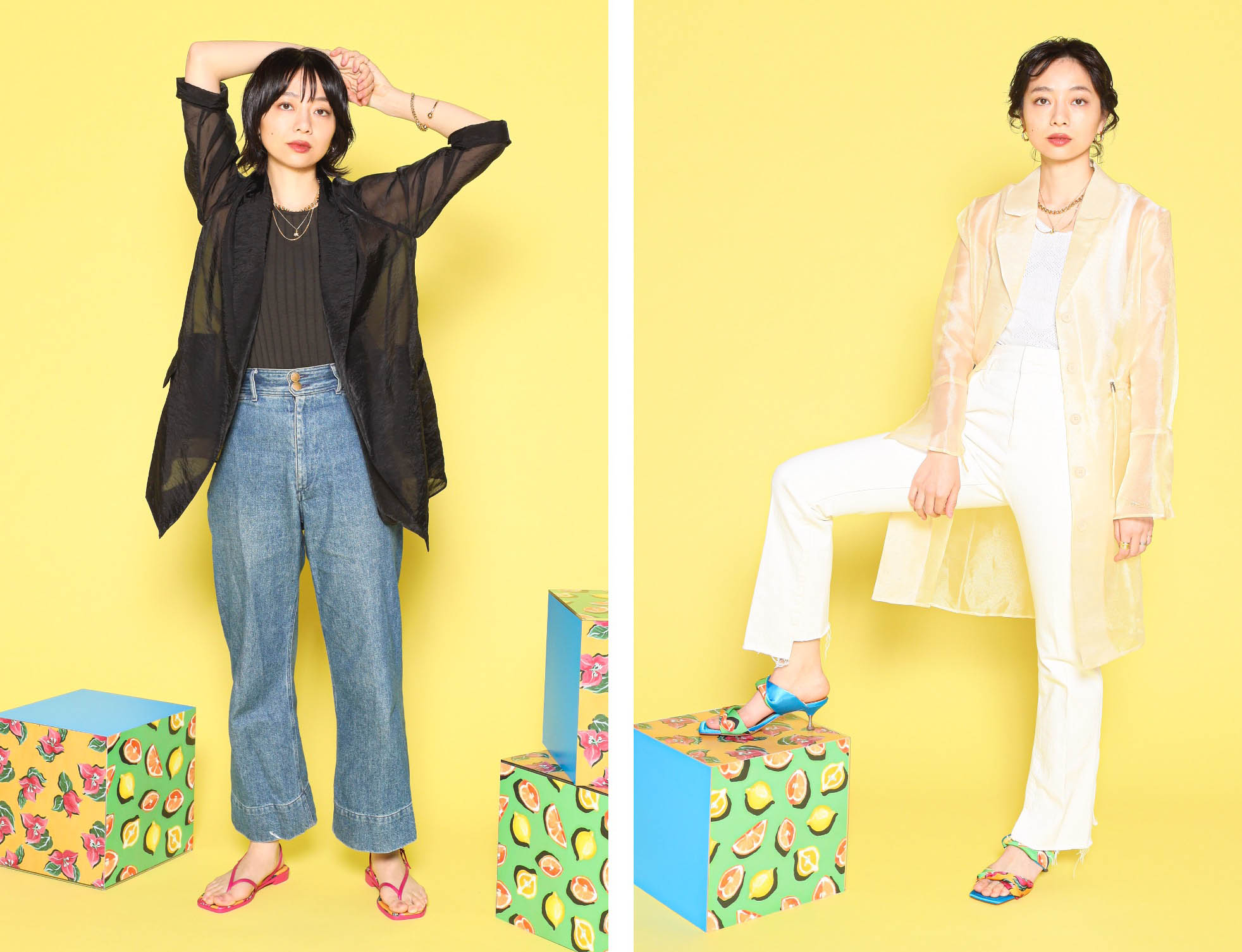2コーデともデニムやタンクトップなど、誰でもクローゼットの中にありそうなアイテムをベースに考えました。普段シンプルな服が多い方にこそ、遊びを取り入れやすい小物から始める少しの冒険をご提案したかったんです。