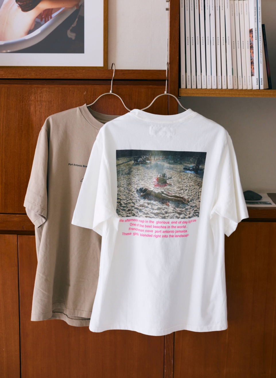 SP BEACH S/SL T-SHIRT「今年注目度が高いフォトTシャツはシンプルが好きな人でも一枚は手に取って欲しいアイテム。去年と同じコーディネートでもTシャツを変えるだけでグッと今年らしく見えるのでおすすめ。Plageで毎回大人気のJANE SMITHとの別注Tシャツの新作です。コンパクトなサイズ感ながらネック周りが詰まりすぎてないので女性らしい印象に。ウォッシュ加工を施しているのでほんのりヴィンテージ感のある風合いと遊び心のあるバックプリントが魅力。継続的な人気を誇るのは安定感のある素材感と着心地。」
