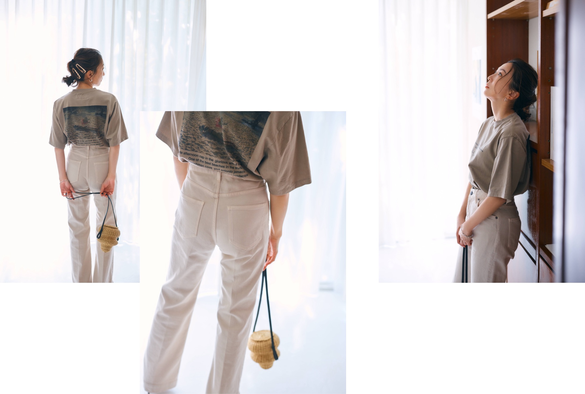 「私の定番中の定番は無地のTシャツですがここ最近は毎年ロゴTをワードローブにプラスしていました。でも今年は断然フォトTに注目。ロゴよりも女性らしく見えたり大人な印象になるのでこのトレンドはすぐに取り入れたい。1+1のコーディネートになりがちなTシャツスタイル、今年やりたかったベージュのワントーンでまとめてカジュアルすぎない印象に。簡単な足し算で素敵に見えるにはやっぱりベーシックの見直しが重要なキーポイントですよね。」
