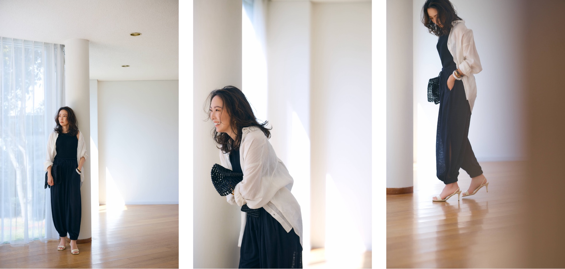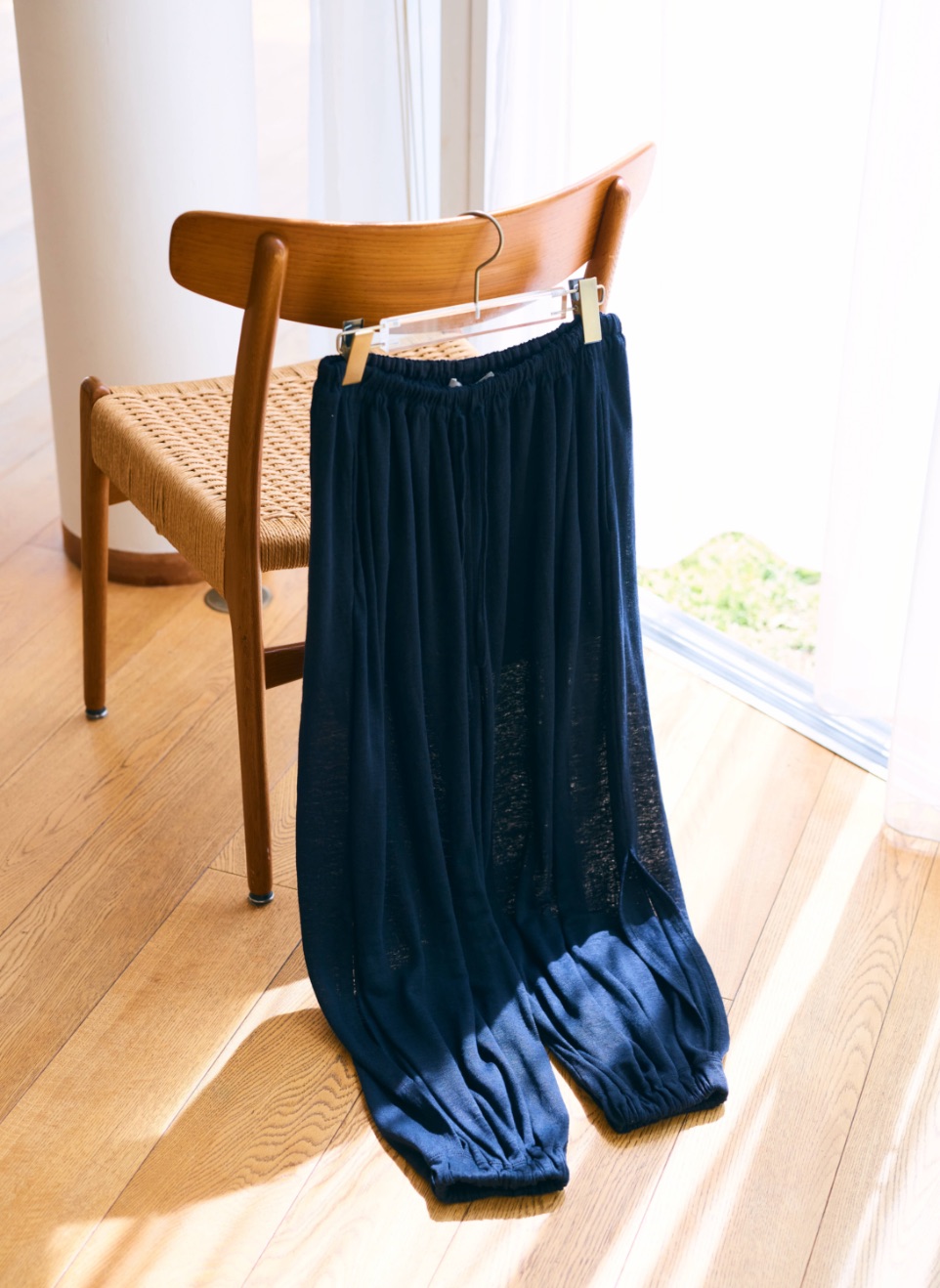 DRAW ST PANTS「ナチュラルな透け感が涼しげなリラックスパンツはおうち時間が長くなった今のんびりおうちDayにも履きたいパンツ。もちろんお出かけにも履いていけるきちんと見えも兼ね備えたパンツは裾の絞られたデザインがあまり見ない個性的な印象。膝下に入ったスリットが歩くと見え隠れするのでリラックス感の中にも女性らしさが垣間見えるのが魅力。ヒールを合わせるとぐっと女ぽい印象に見えるので小物で表情がぐっと変わるのも面白い。」