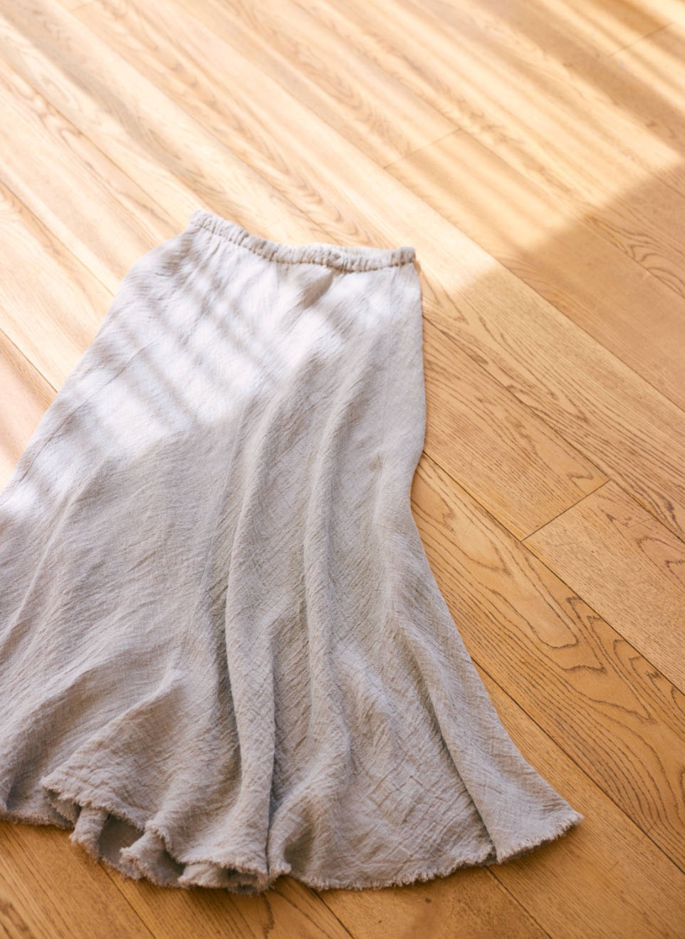 「涼しげで女らしいシルエットのスカートは夏に一枚あると万能。リネンガーゼの名前の通り夏らしいざらつきのある素材、体のラインにそうマーメイドシルエットがふんわり甘すぎないヘルシーな印象のスカート。普段パンツ派の人でも気負わずにはけるハンサムシルエットです。軽い素材感で透け感もあるので歩くたびに揺れて光が当たるとほんのり透けるのも魅力のひとつ。ペチコートがついているので安心して着られる。合わせる靴によって印象が大きく変わるので着回しやすい出番の多いアイテムになりそう。」