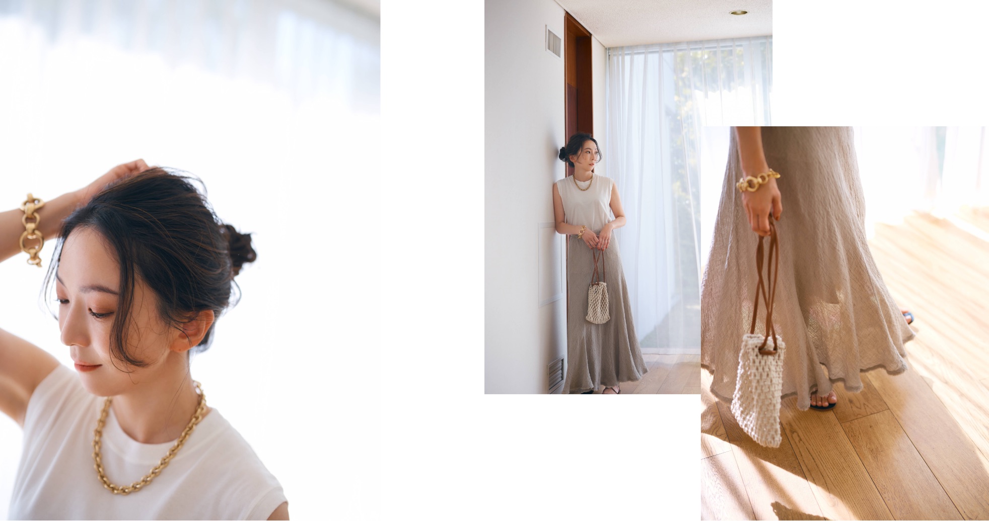 「普段私はスカートをあんまり履かない印象の人が多いと思うんですが、夏になるとスカートやワンピースも着るんですよ。ただし幼く見えなくてハンサムなイメージを保てるもの限定です(笑)。パンツ派ではあるので着ていて落ち着かないスカートはなかなか履かなくなるのが目に見えてるのでハンサム見えが条件で選びます。そんなスカートのコーディネートはデニムの時と同じ感覚で。シンプルに1+1。ただし今期は大ぶりアクセもトレンドなのでアクセで盛ります。肌見せよりもキラッとアクセで女っぽく仕上げるのが今っぽく見える秘訣かな。」