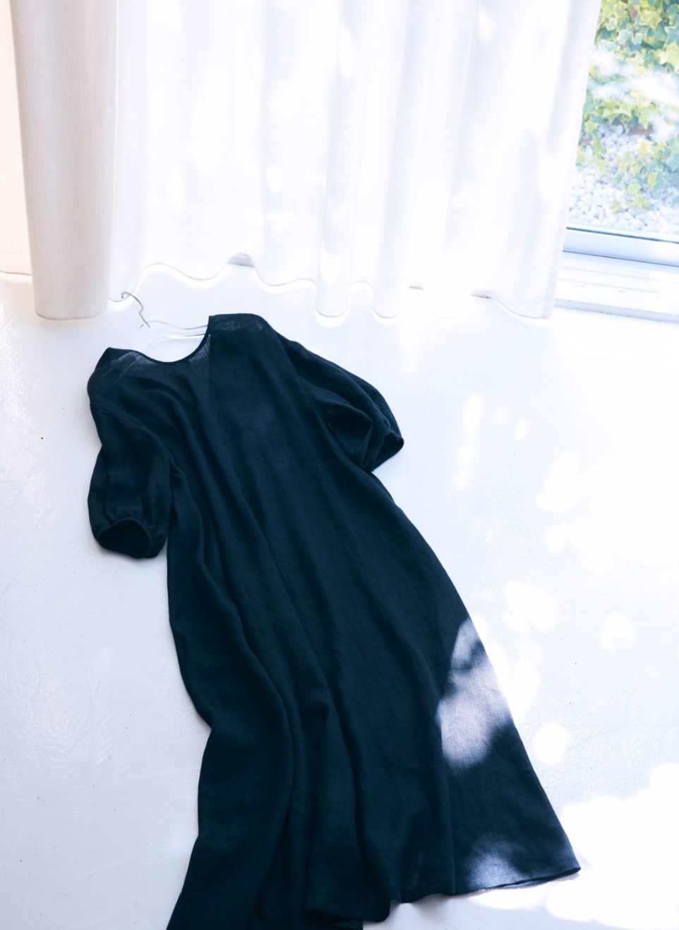 「夏に欠かせないワンピースはせっかくだから夏らしい素材感を楽しみたい。リネン100%のワンピースは一枚で着るのはもちろんデニムやレギンスとの重ね着にも最適。つい手が伸びてしまう黒も素材の透け感で重くならずに涼しげに着られるのも高ポイント。着方によってはモードにも、リラックスにも振れる振り幅の広いアイテムなのでワードローブに一枚加えて欲しい。インナーに1枚でも着られるようにリブワンピが付いてるので透けも心配無用。重ね着の時はインナーなしの透け感を楽しんで。」