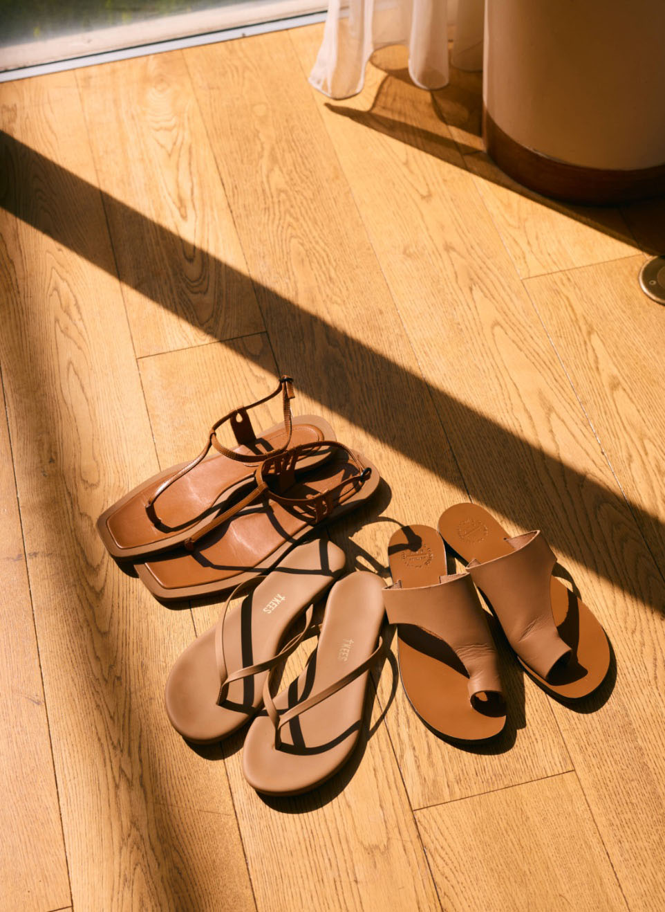 「今期注目したいのはヌーディーなベージュのサンダル。ホワイト系のワントーンやダークカラーのコーディネートの抜け感として足元がヌーディなのは今っぽい。中でも肌見せ部分の多い華奢サンダルはボトムスの長さを選ばないので出番が多くなるはず。ワードローブに一つあると便利です。」