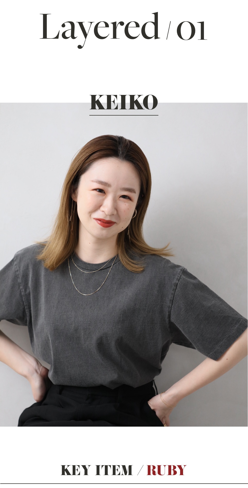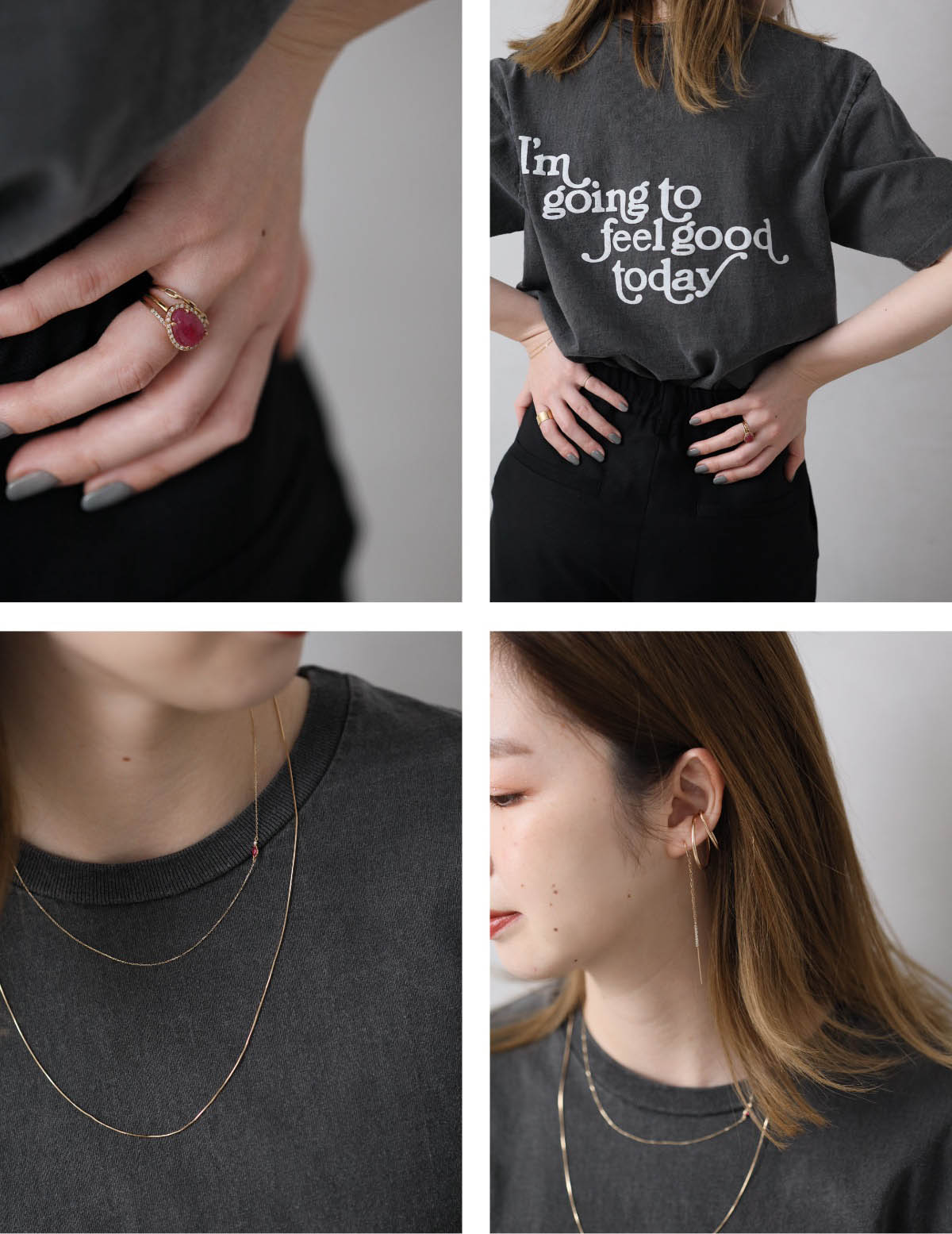 - ルビーをアクセントにしたレイヤード。きれいめに落ち着きすぎないよう地金と組み合わせてトレンド感もプラス。鮮やかな色と艶のあるジュエリーの重ねづけはこれからのシーズンにもおすすめです。